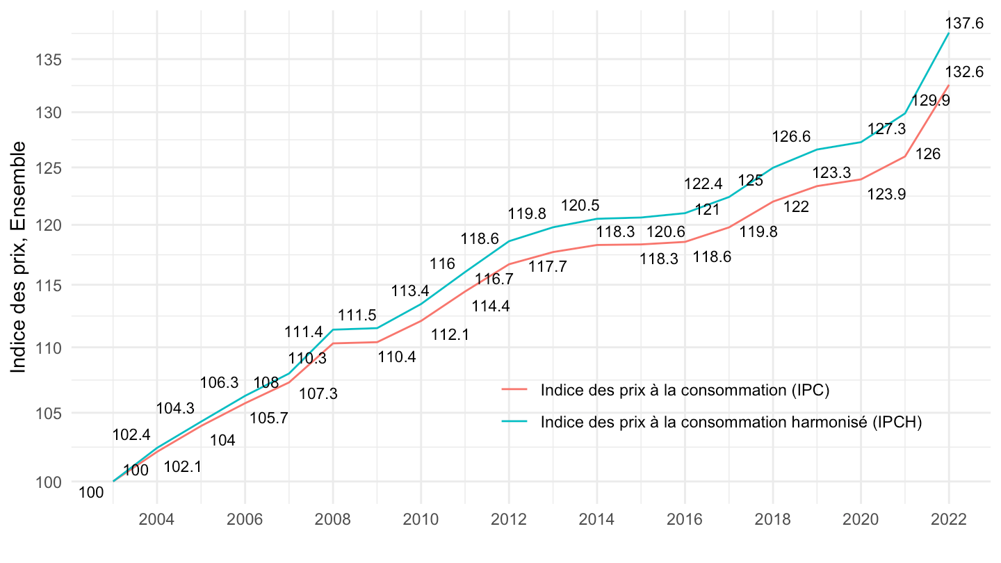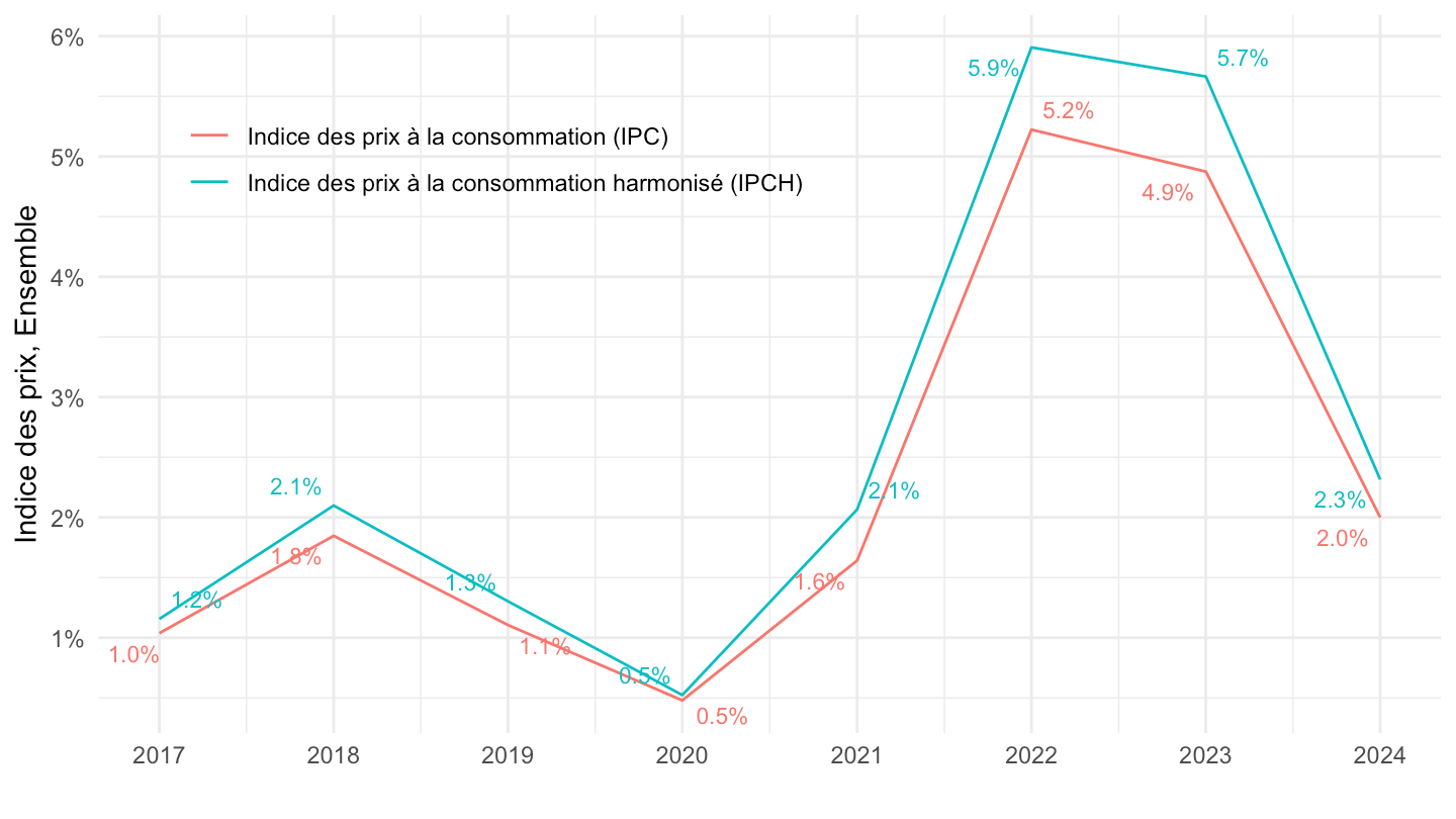 La principale différence entre l’IPCH et l’IPC porte sur les dépenses de santé : l’IPCH suit des prix nets des remboursements de la sécurité sociale tandis que l’IPC suit des prix bruts.