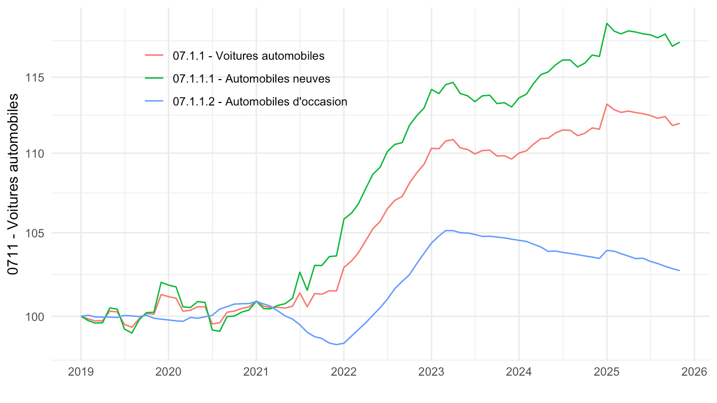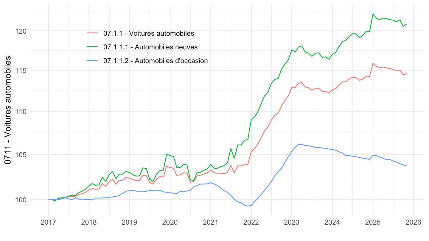 ggplot() + ylab("0711 - Voitures automobiles") + xlab("") + theme_minimal() +