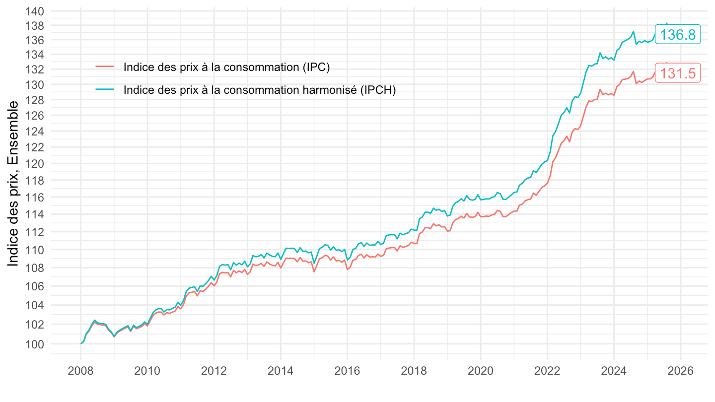 filter(date == max(date)), aes(date, y = OBS_VALUE, label = round(OBS_VALUE, 1), color = Indicateur),