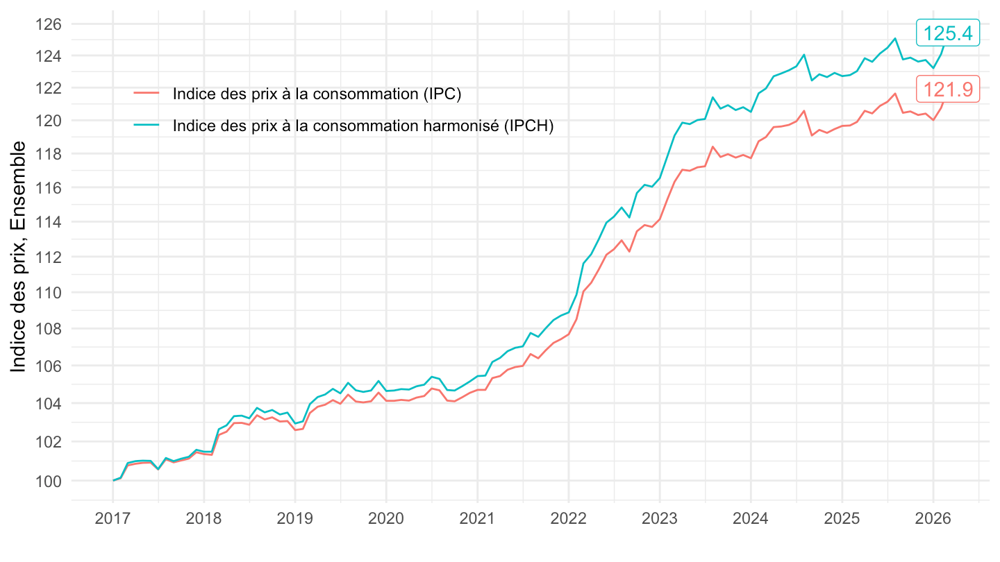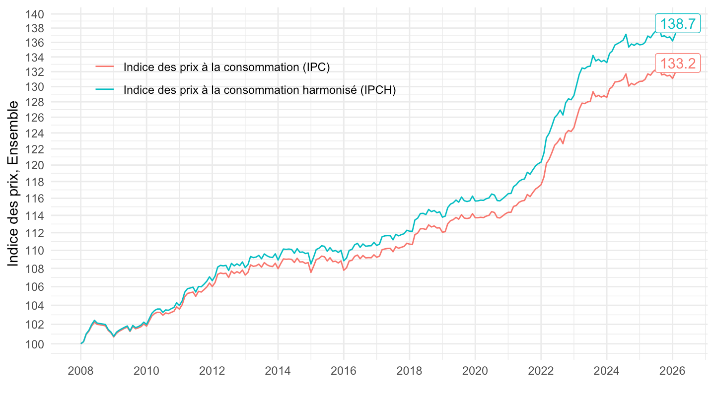 ggplot() + ylab("Indice des prix, Ensemble") + xlab("") + theme_minimal() +