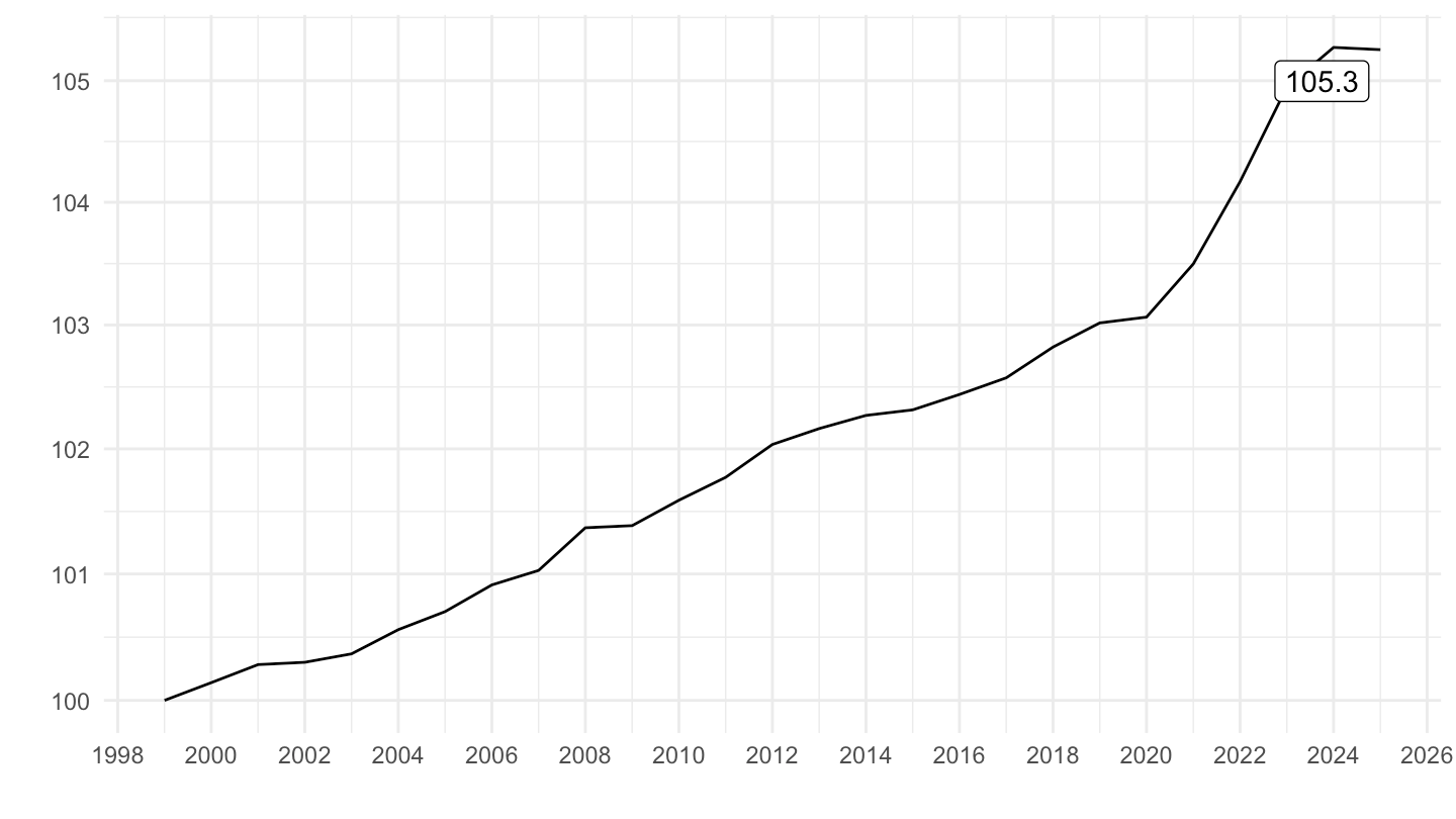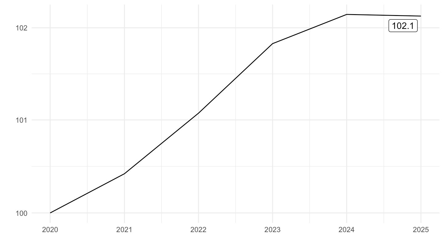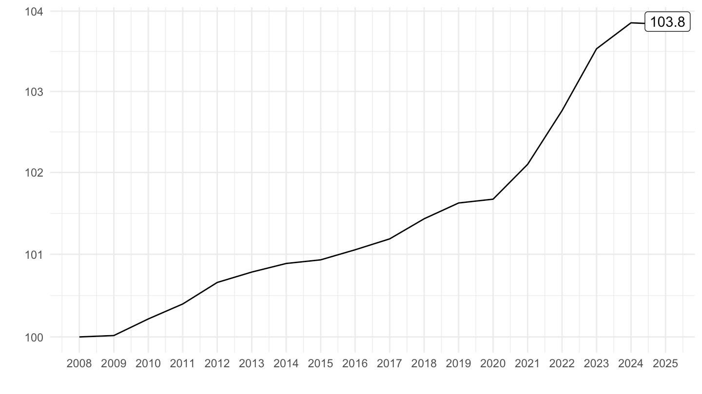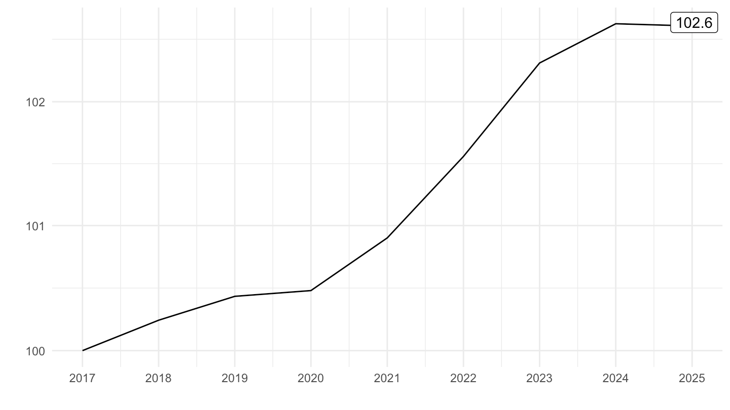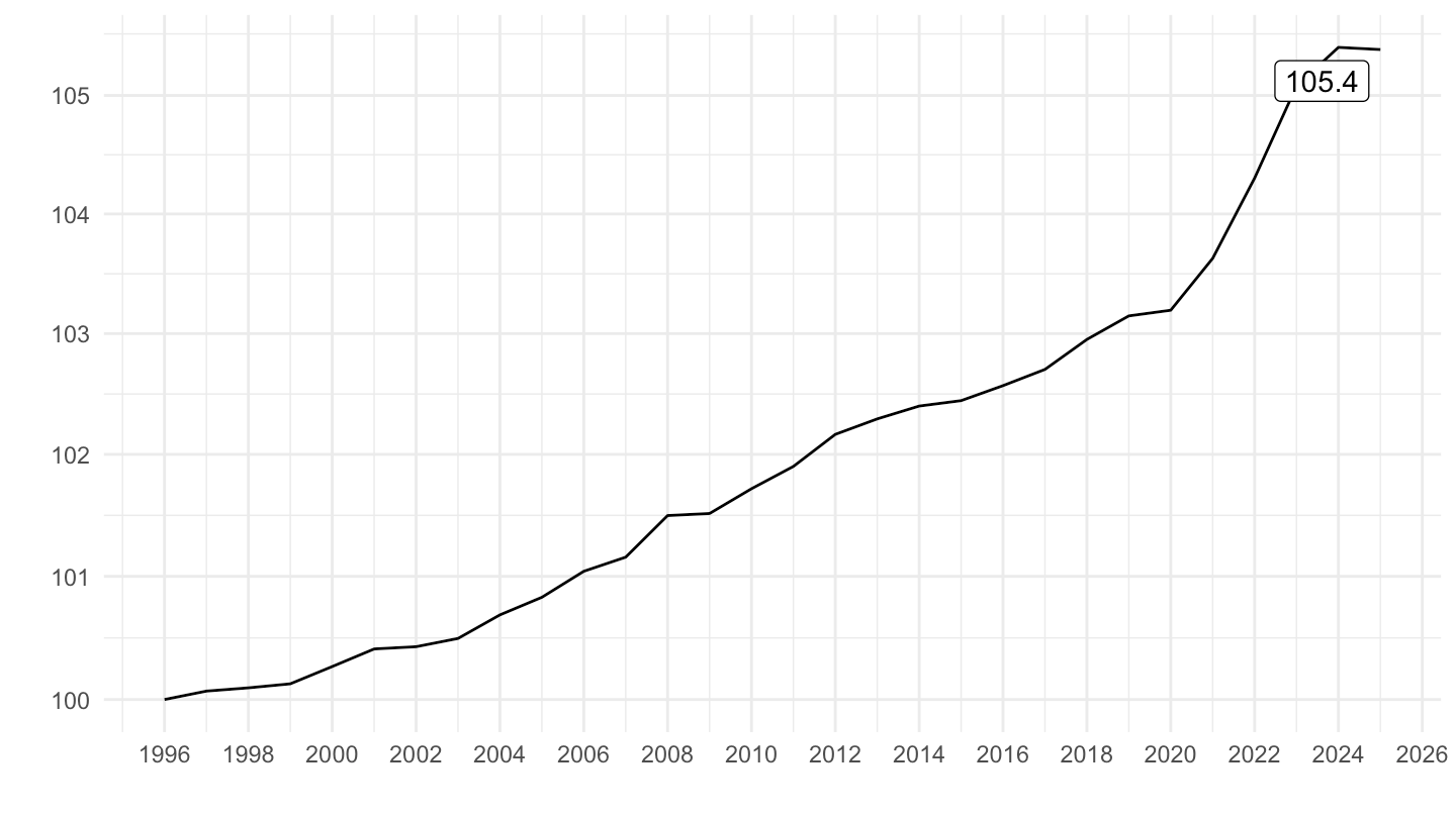 mutate(OBS_VALUE = 100*OBS_VALUE/OBS_VALUE[1]) %>%