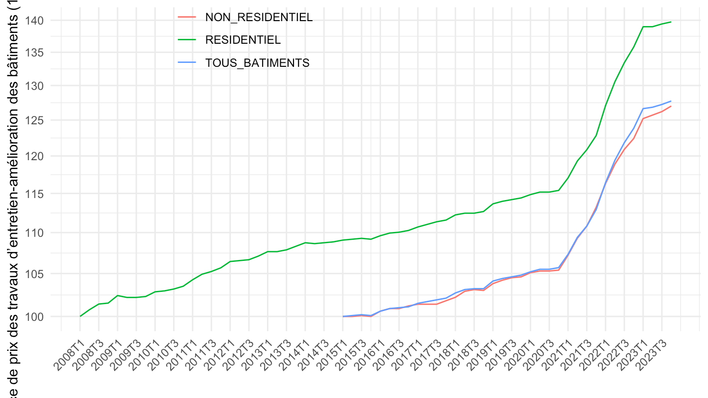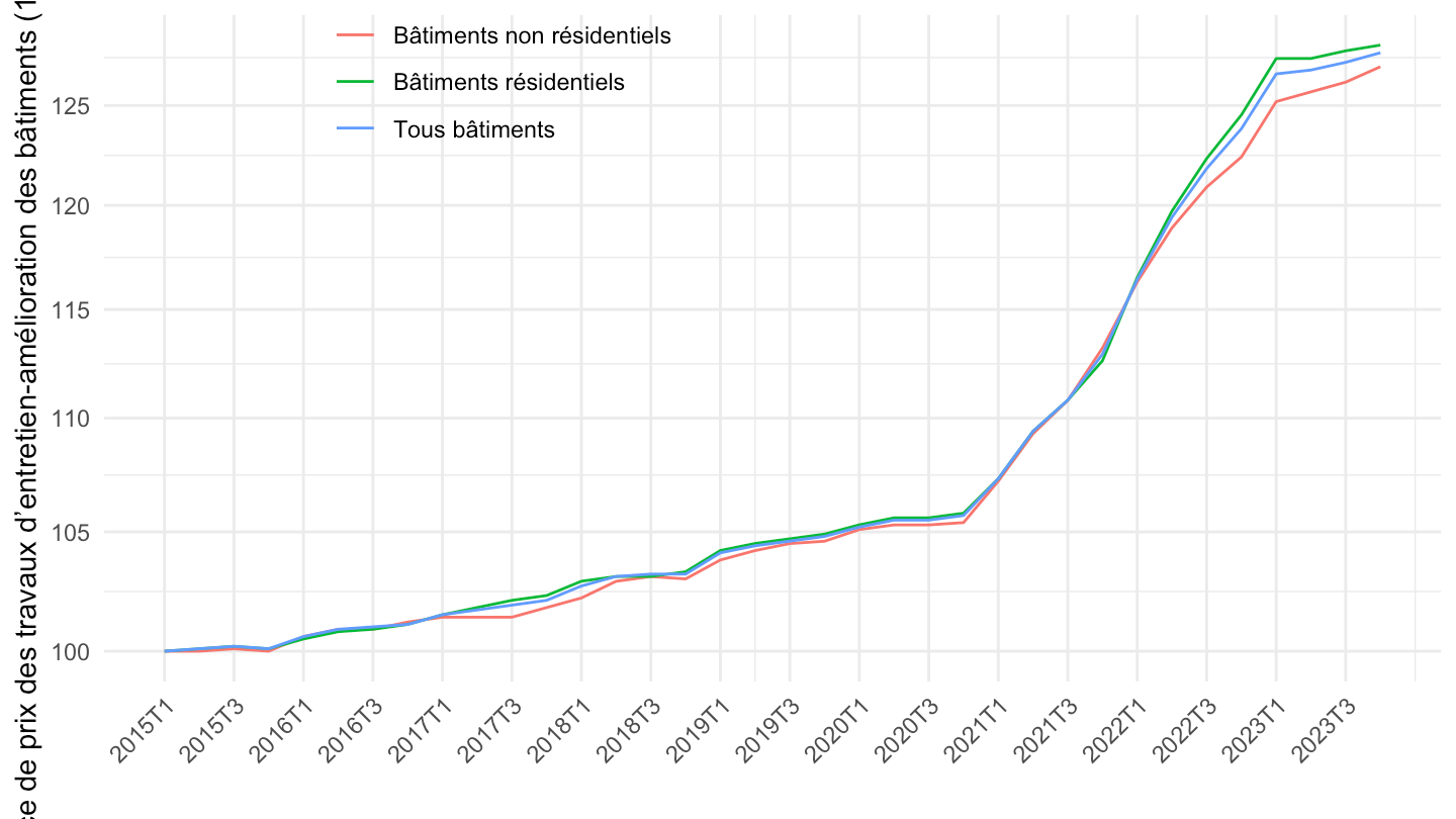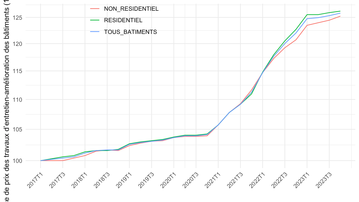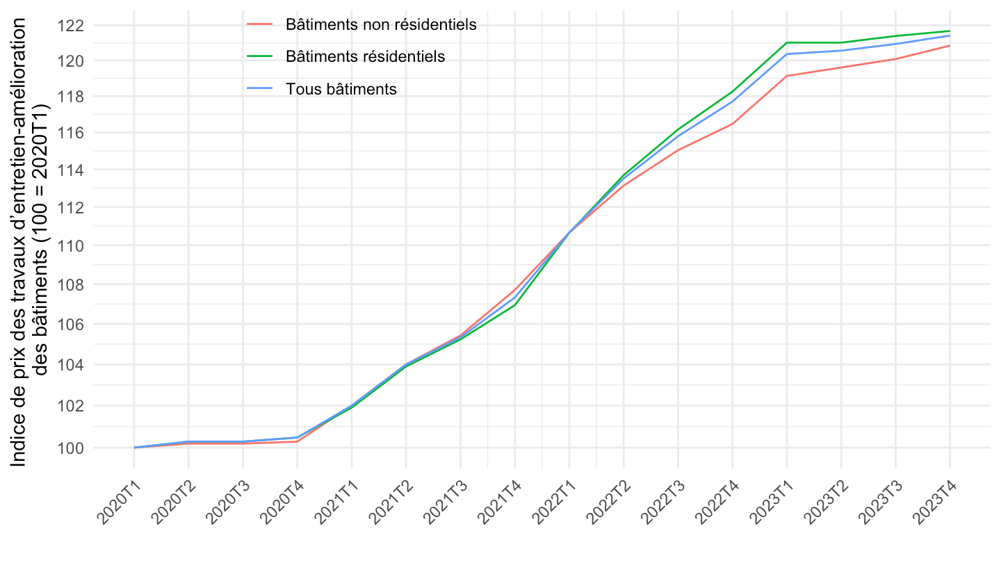 ggplot theme_minimal() + xlab("") + ylab("Indice de prix des travaux d’entretien-amélioration \ndes bâtiments (100 = 2020T1)") +