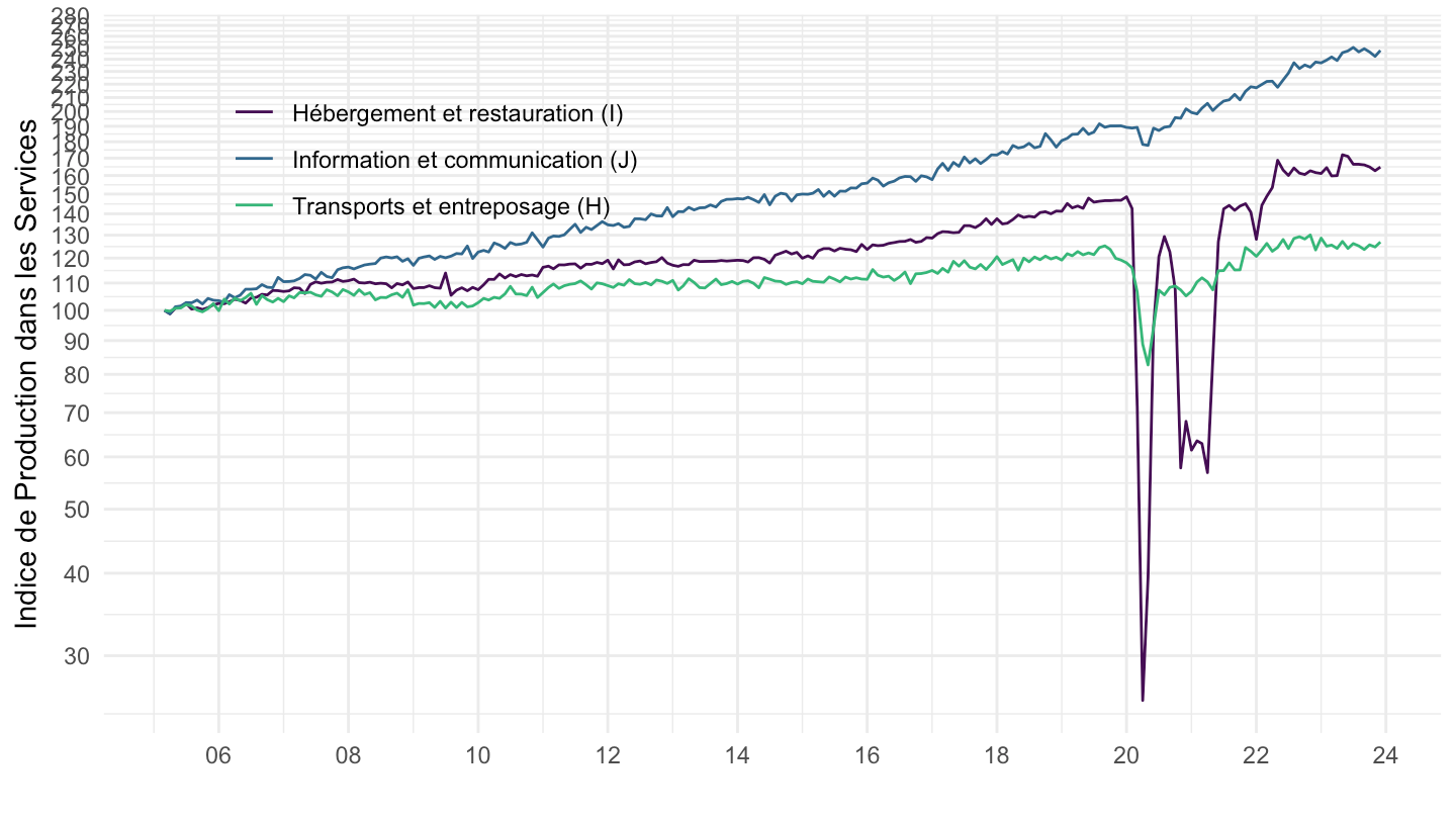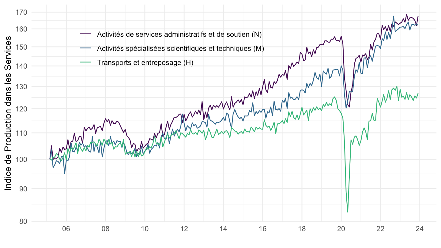 ggplot() + ylab("Indice de Production dans les Services") + xlab("") + theme_minimal() +