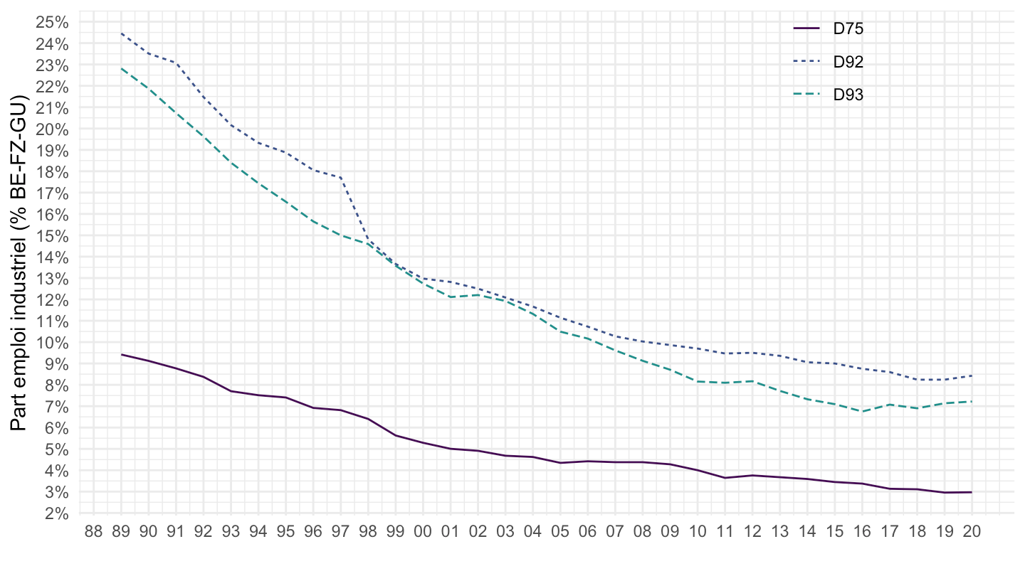 ggplot xlab("") + ylab("Part emploi industriel (% BE-FZ-GU)") + theme_minimal() +