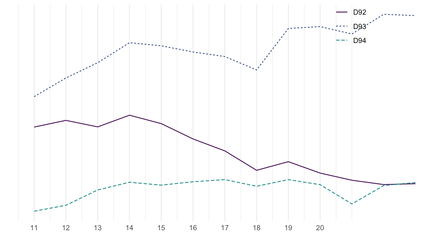 year_to_date + geom_line(aes(x = date, y = OBS_VALUE, color = REF_AREA, linetype = REF_AREA)) +