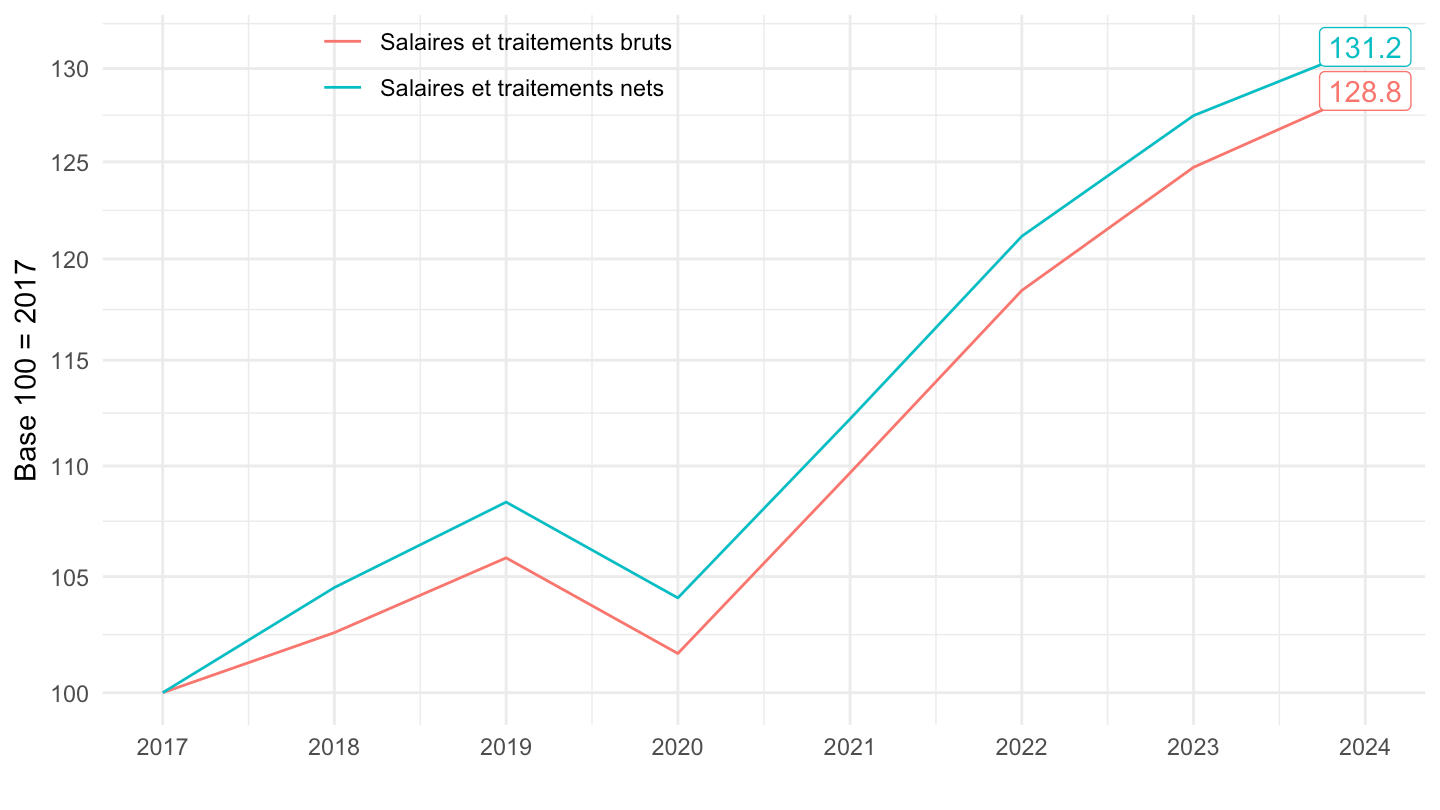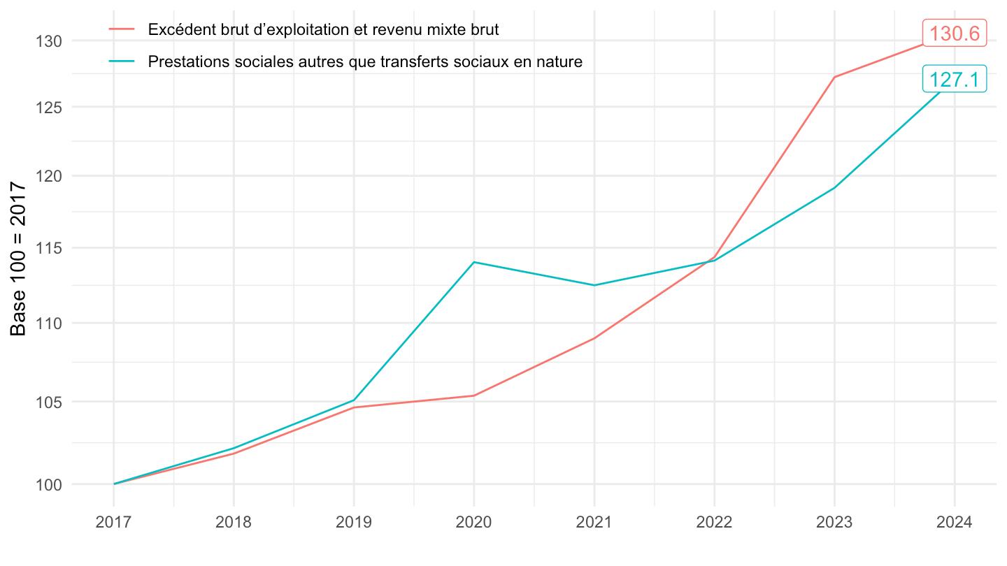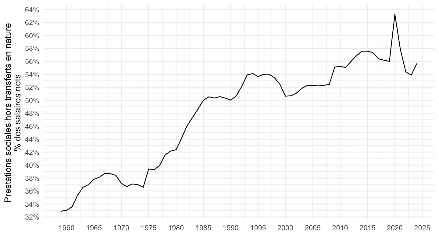 theme_minimal() + xlab("") + ylab("Prestations sociales hors transferts en nature\n% des salaires nets") +