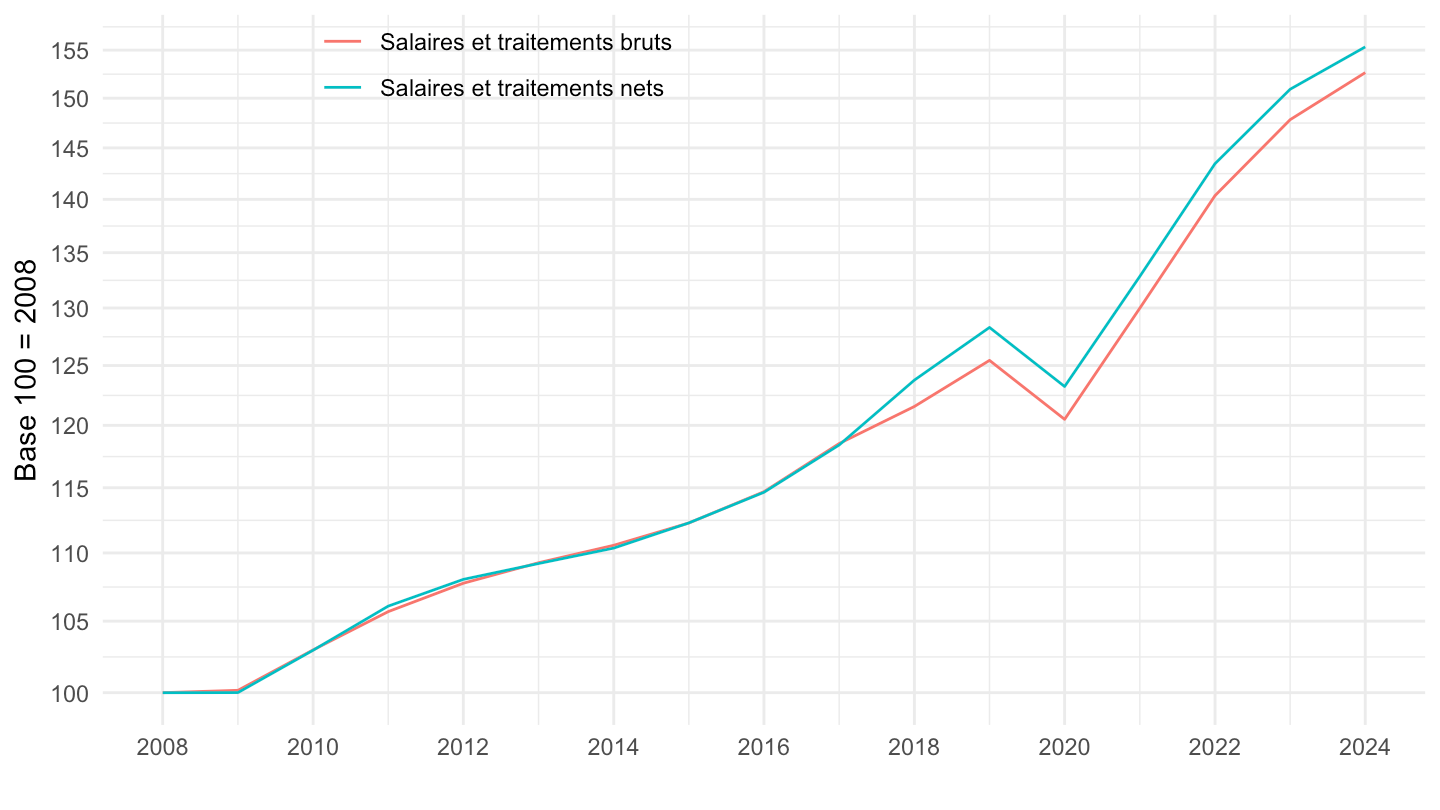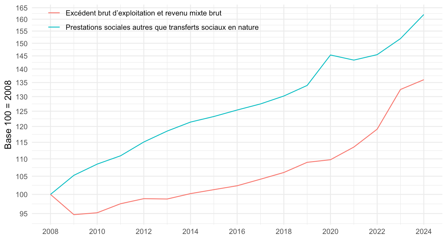 theme_minimal() + xlab("") + ylab("Base 100 = 2008") +
