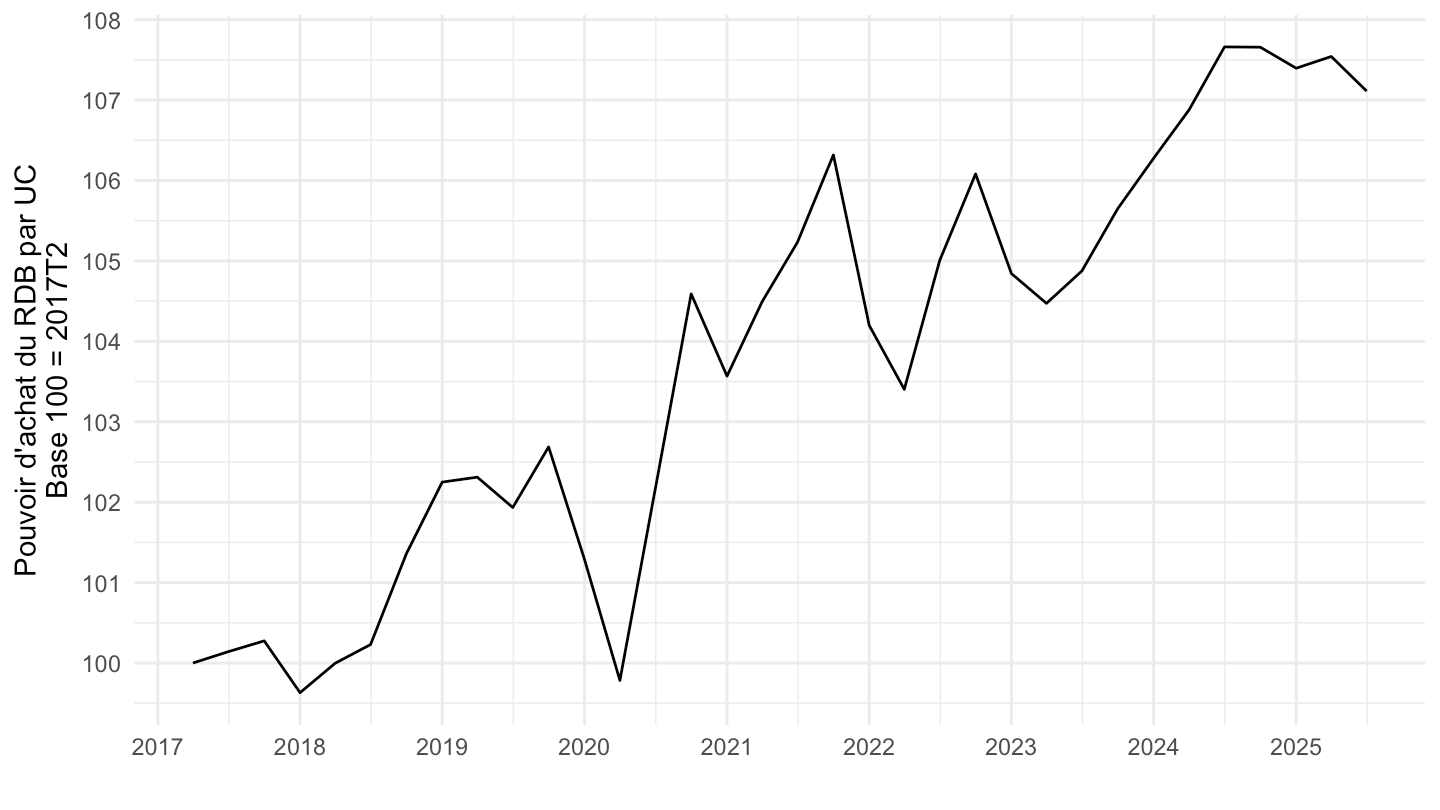 theme_minimal() + xlab("") + ylab("Pouvoir d'achat du RDB par UC\nBase 100 = 2017T2")