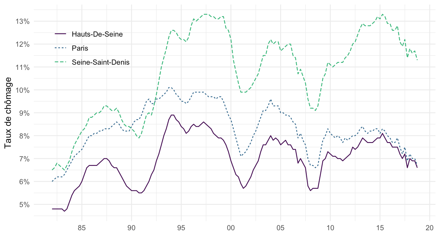 ggplot theme_minimal() + xlab("") + ylab("Taux de chômage") +