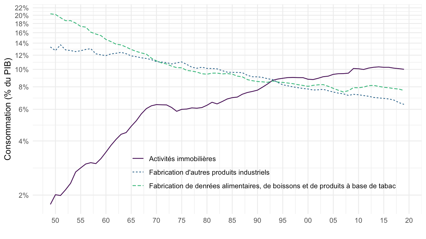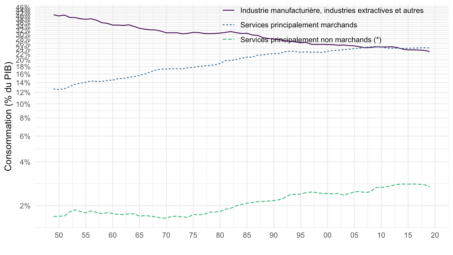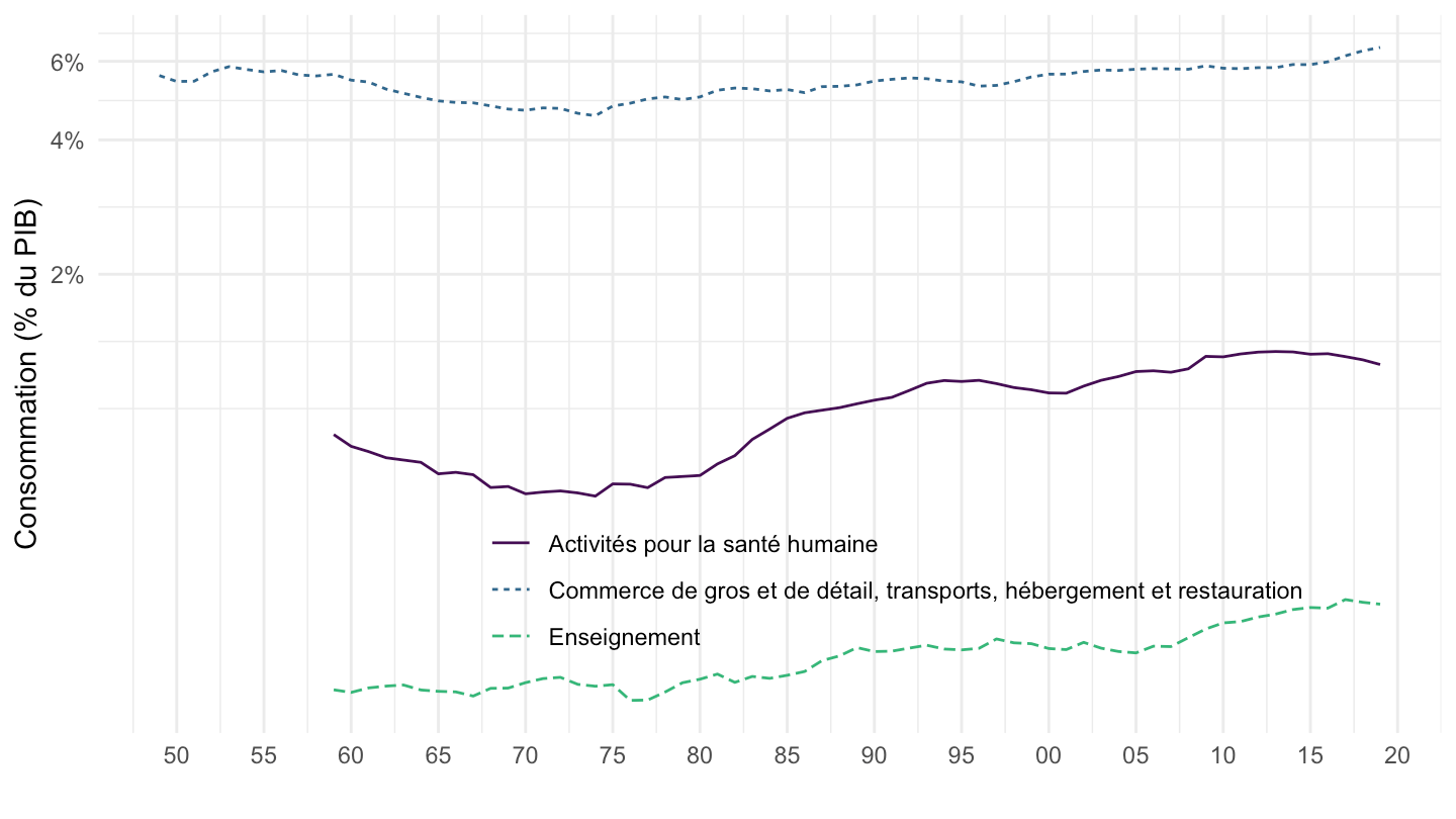 ggplot(.) + theme_minimal() + ylab("Consommation (% du PIB)") + xlab("") +