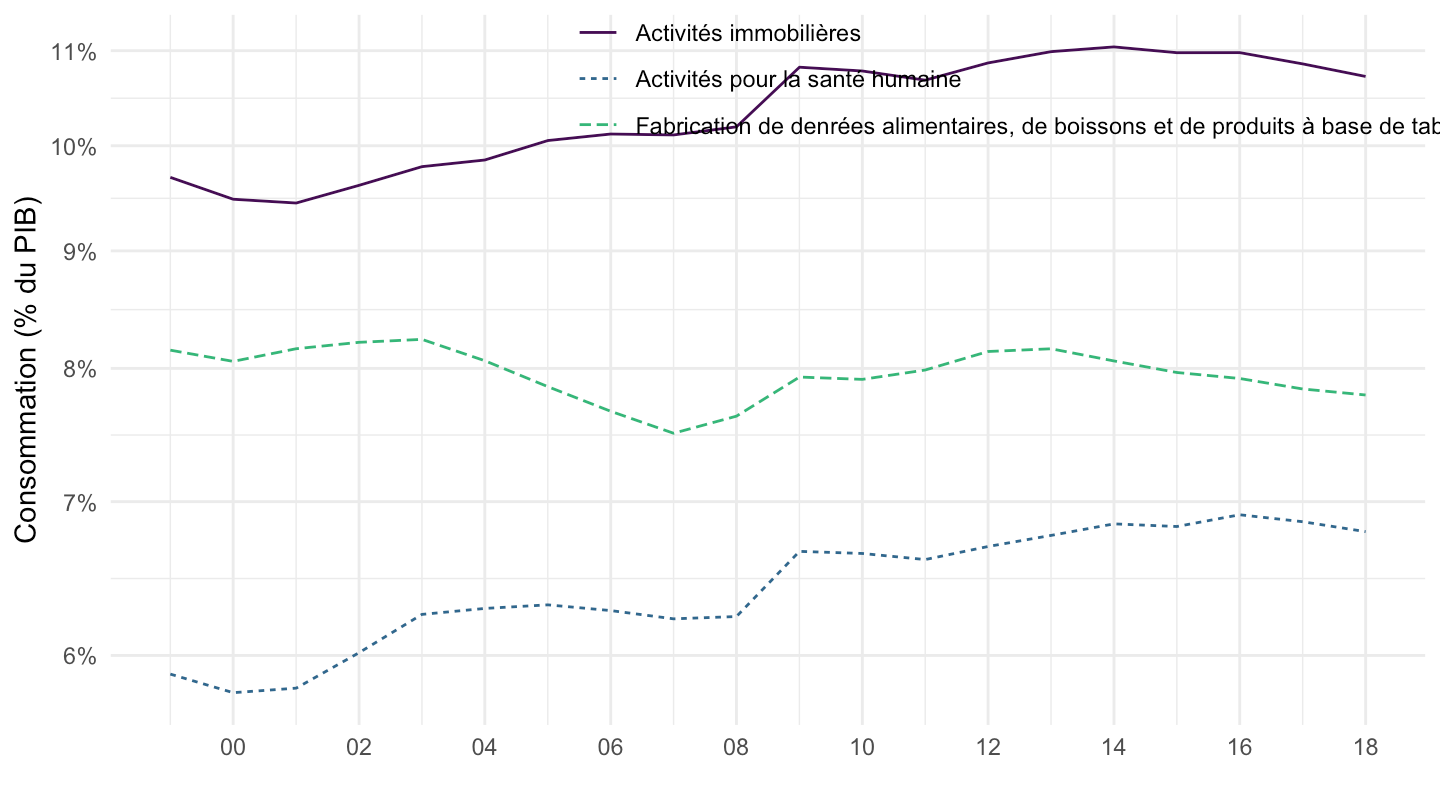 ggplot(.) + theme_minimal() + ylab("Consommation (% du PIB)") + xlab("") +