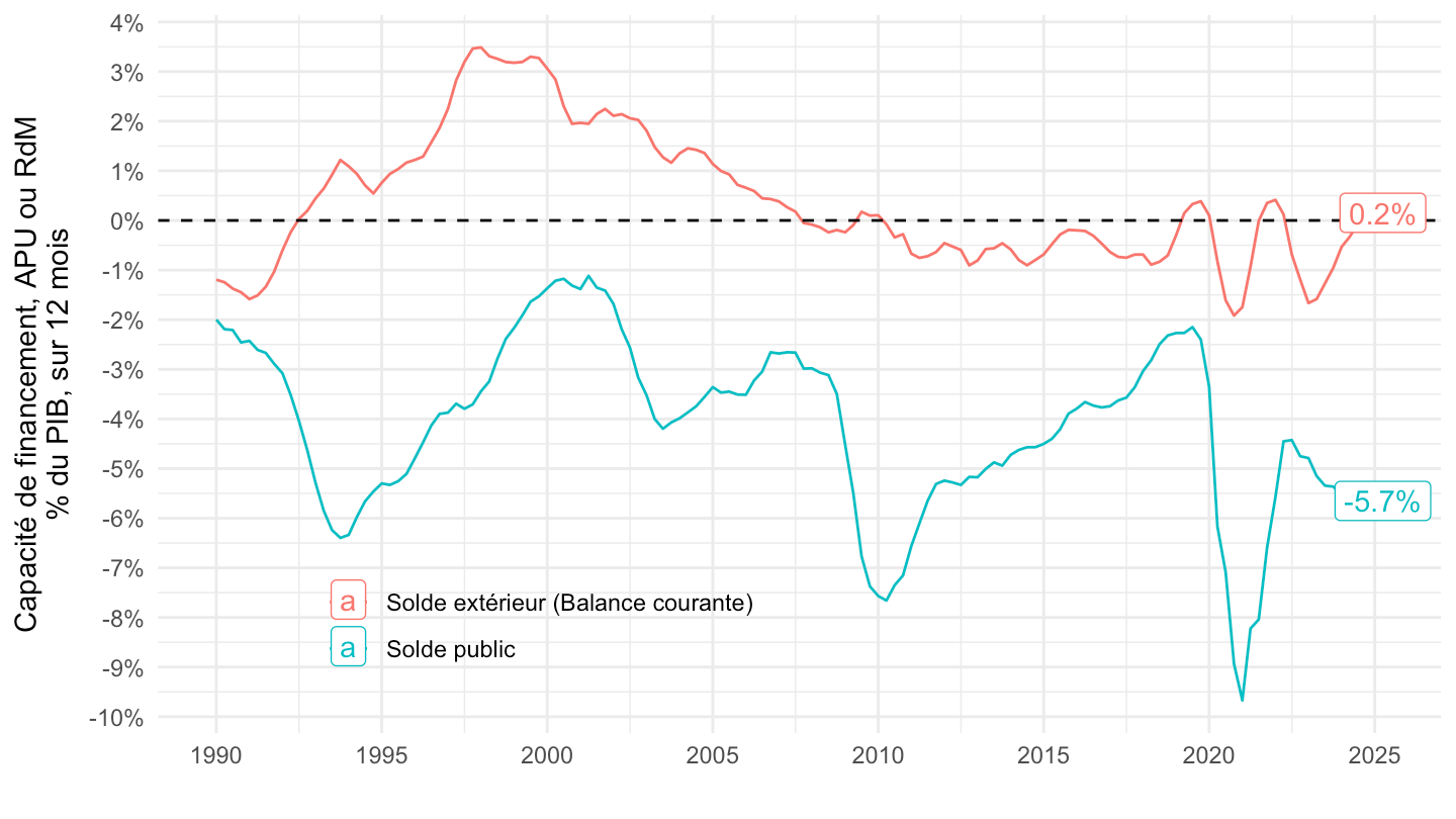ggplot xlab("") + ylab("Capacité de financement, APU ou RdM\n% du PIB, sur 12 mois") + theme_minimal() +