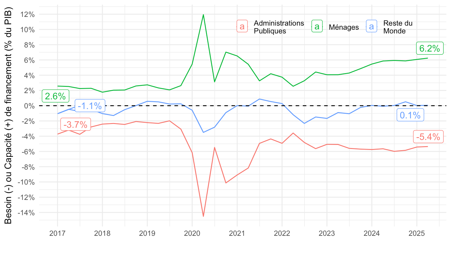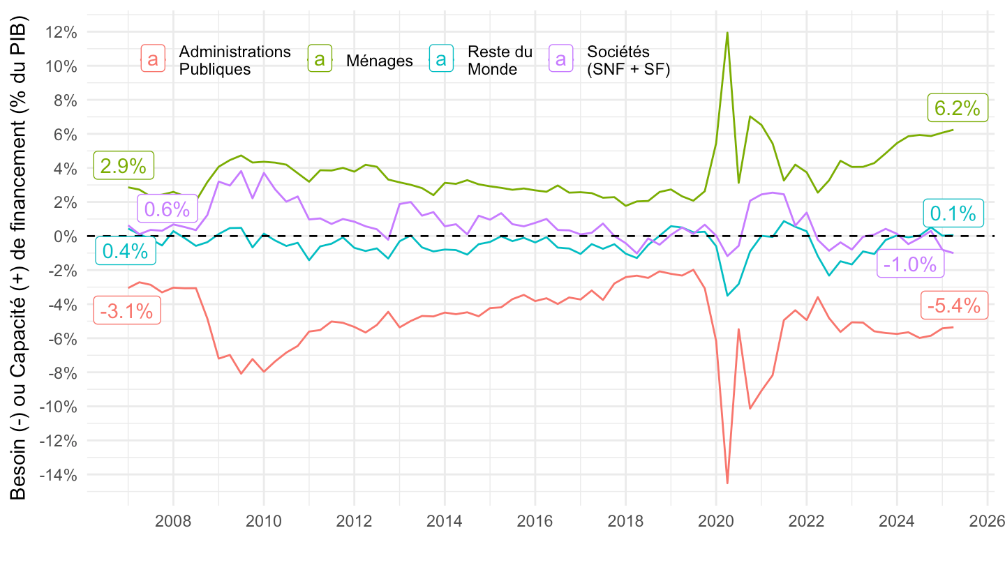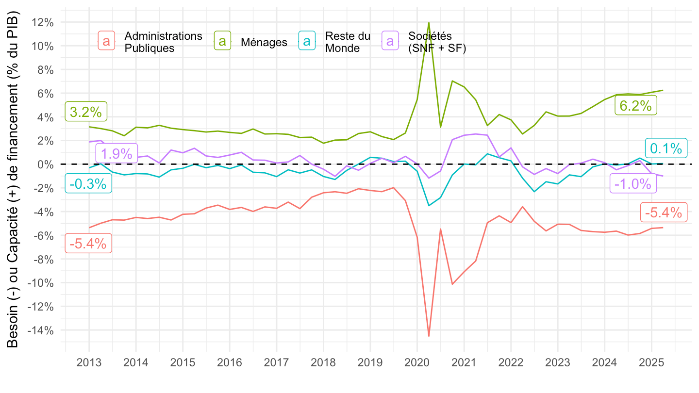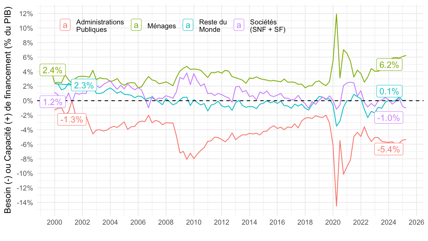 ggplot xlab("") + ylab("Besoin (-) ou Capacité (+) de financement (% du PIB)") + theme_minimal() +