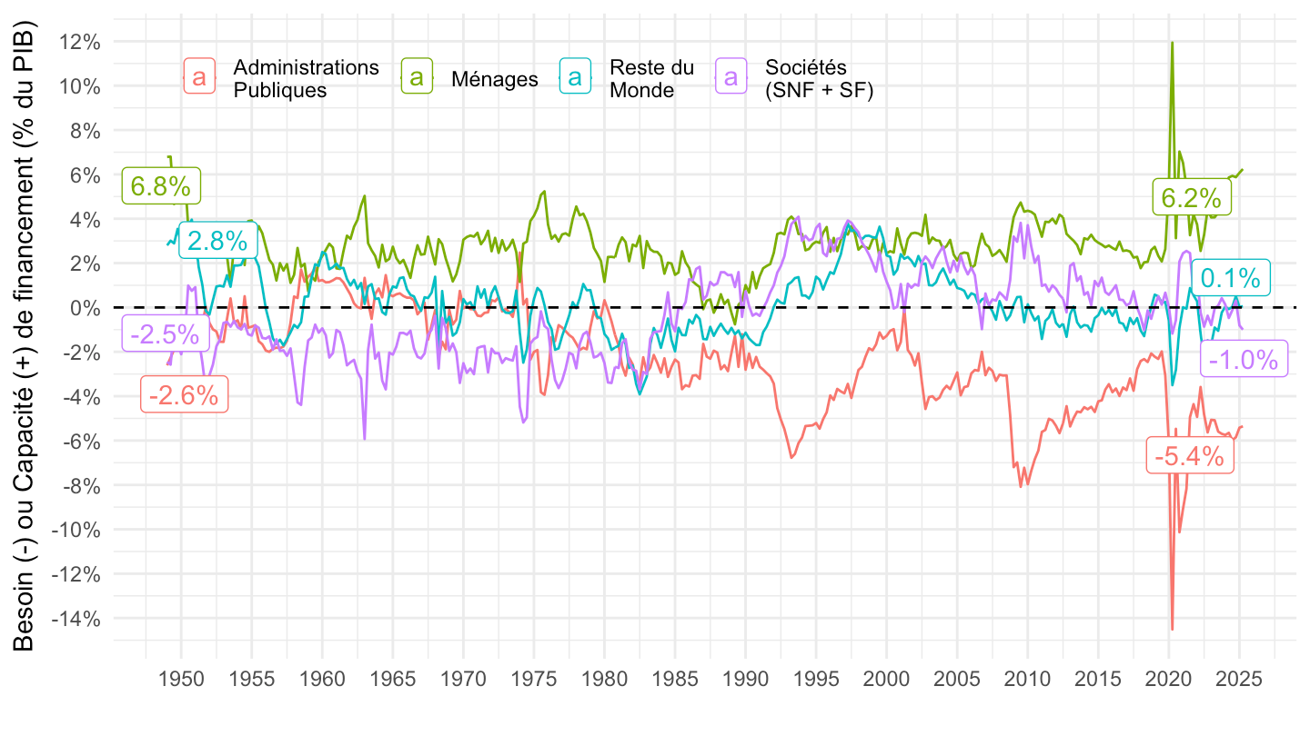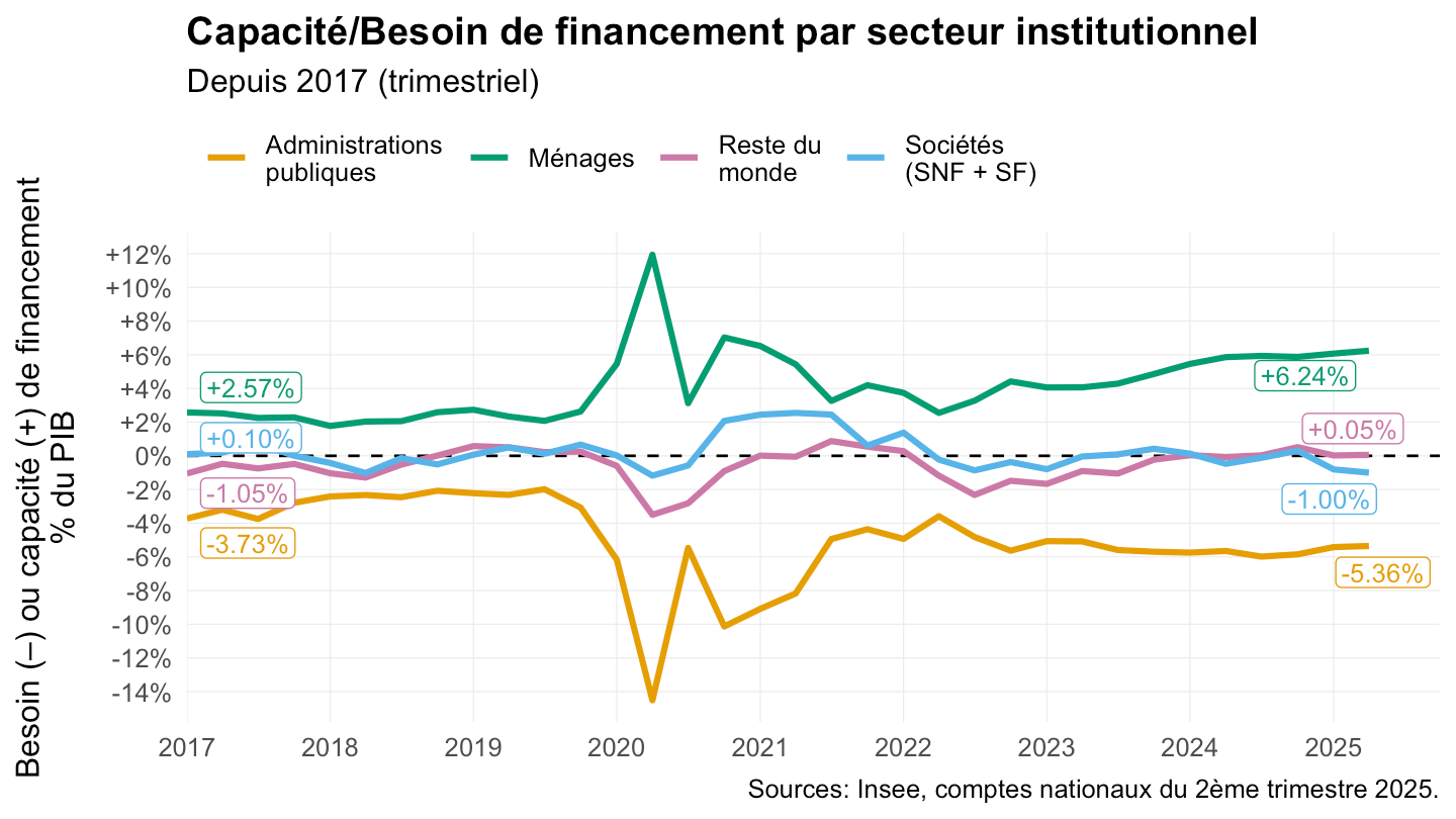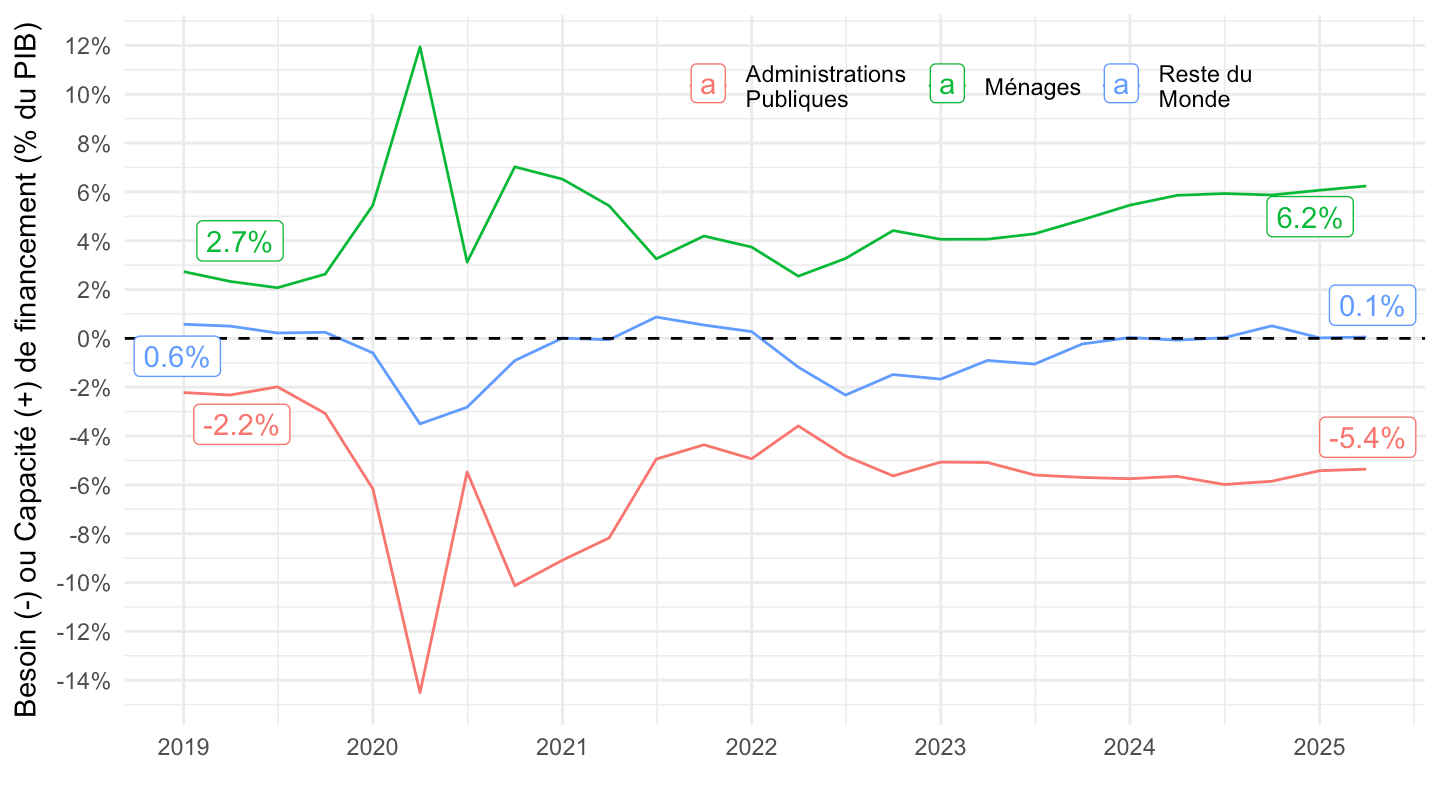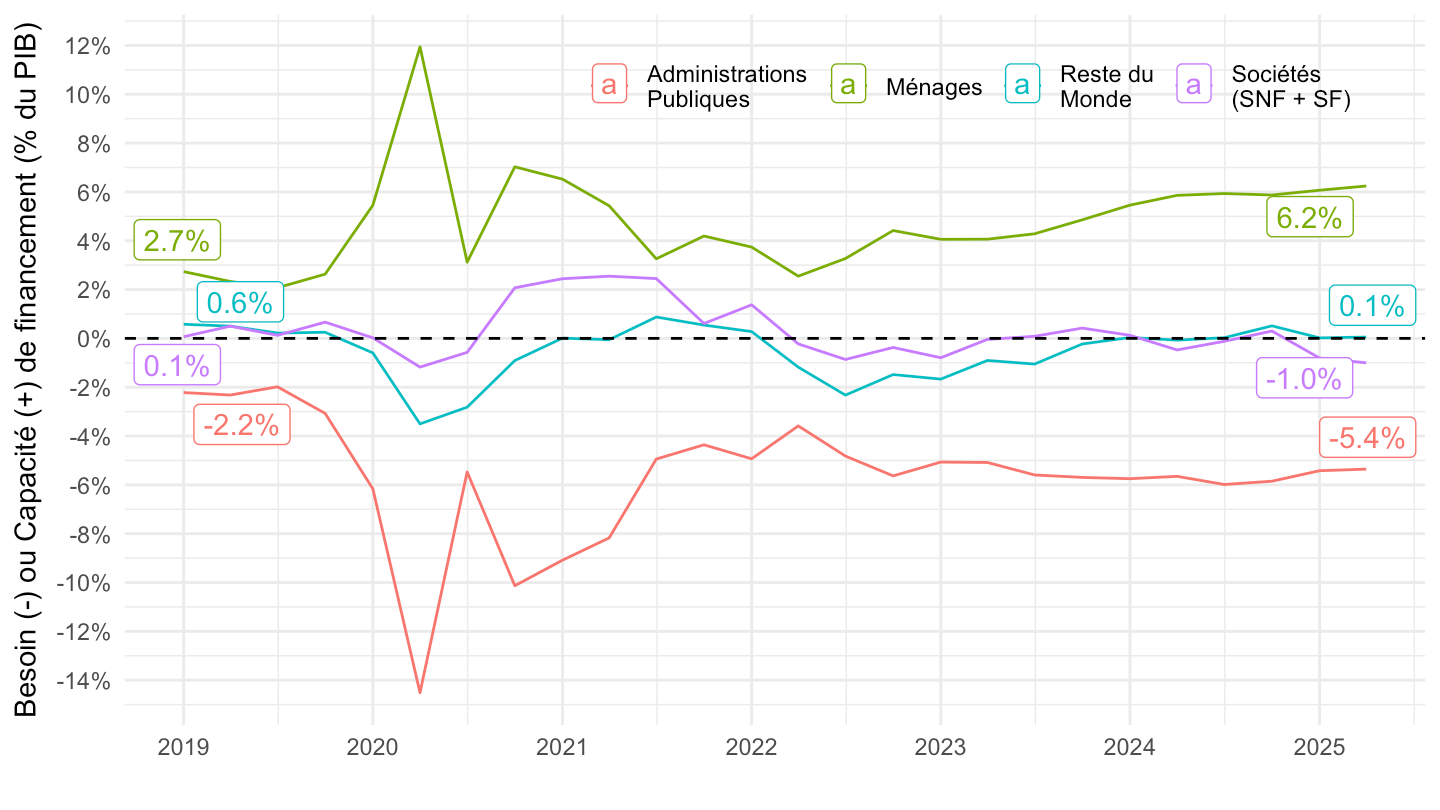 ggplot xlab("") + ylab("Besoin (-) ou Capacité (+) de financement (% du PIB)") + theme_minimal() +