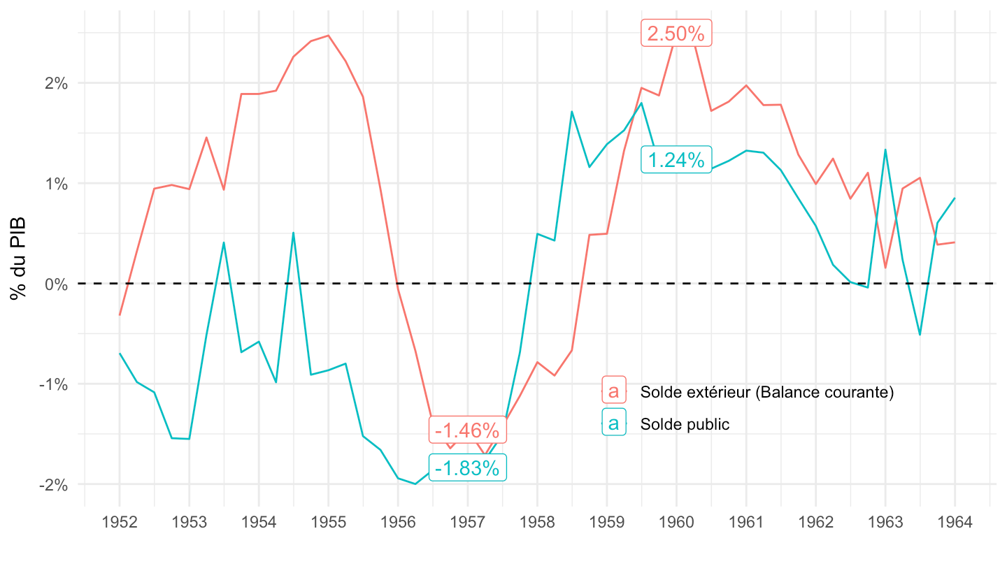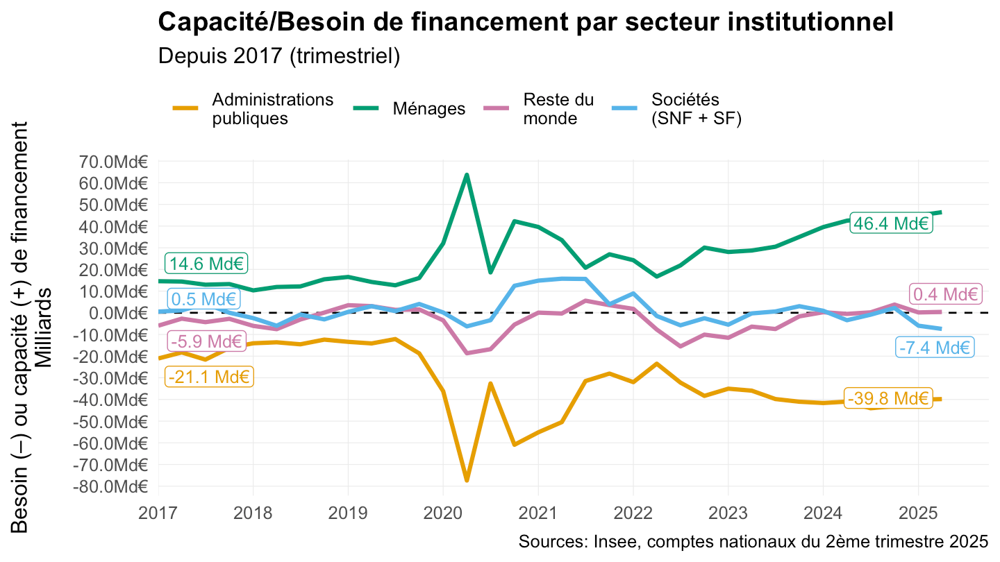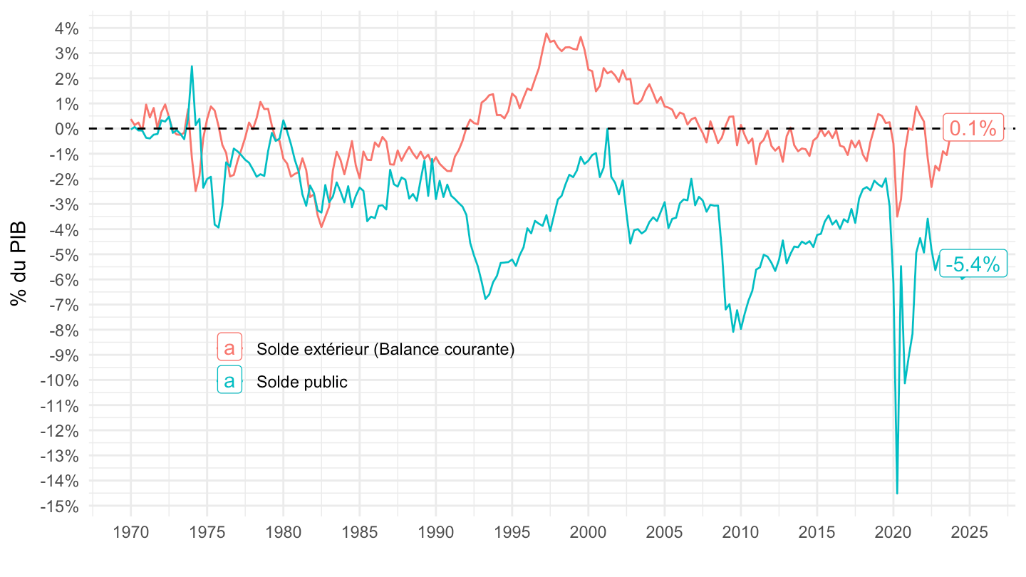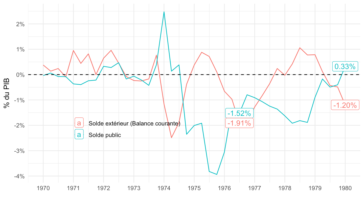 ggplot xlab("") + ylab("Besoin (-) ou Capacité (+) de financement (% du PIB)") + theme_minimal() +