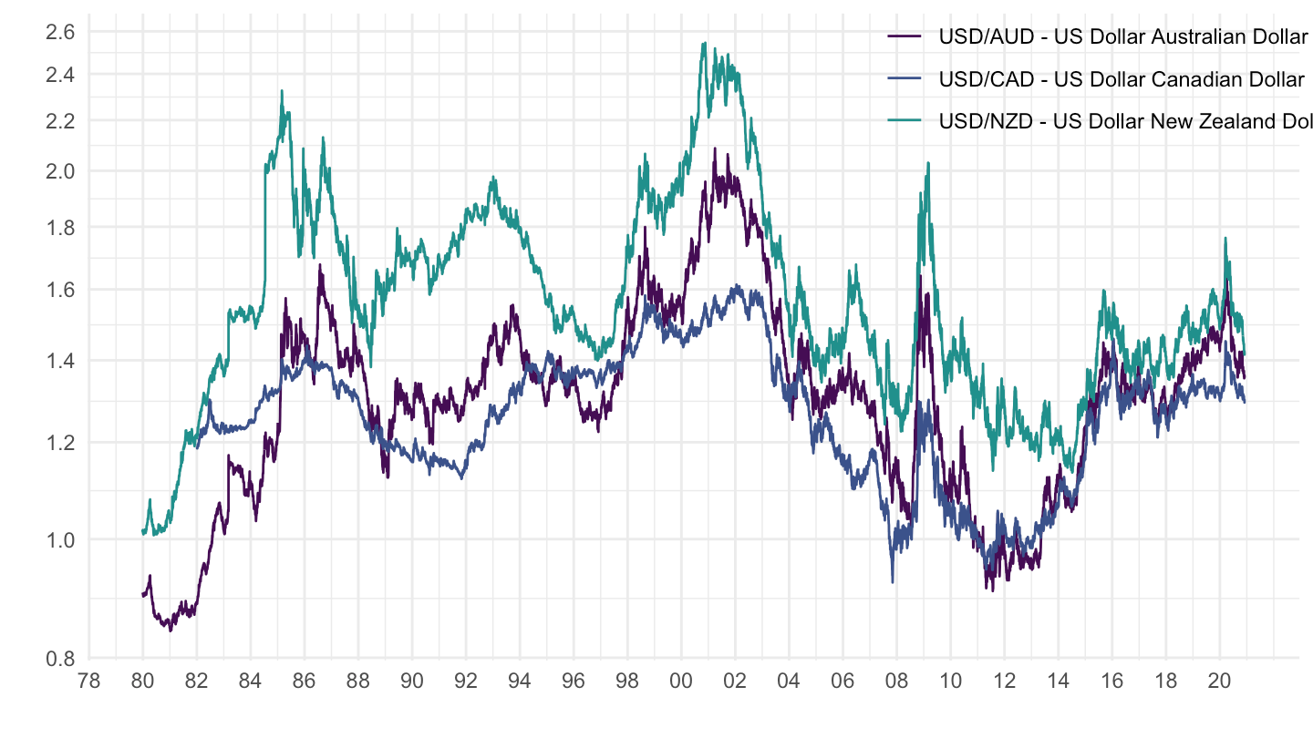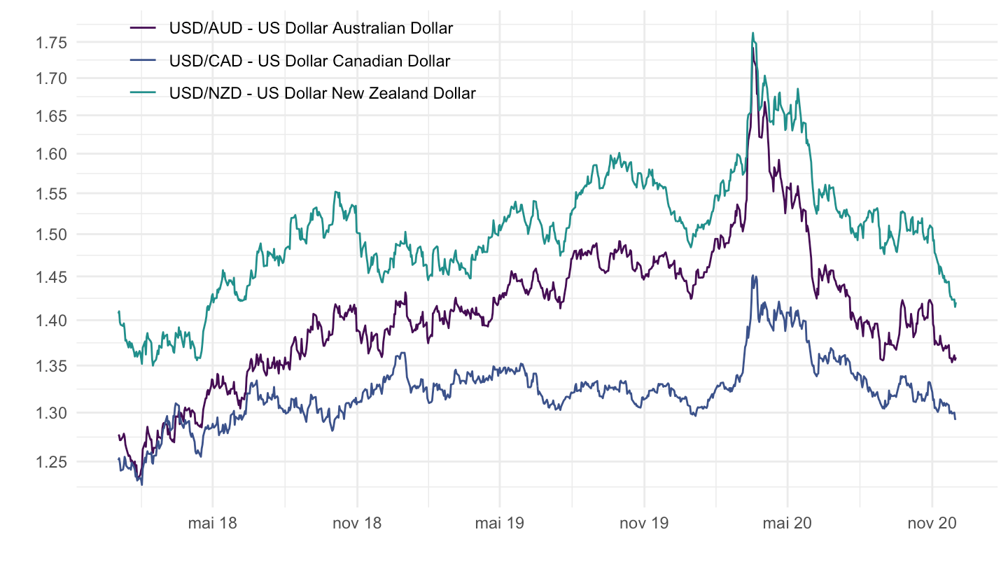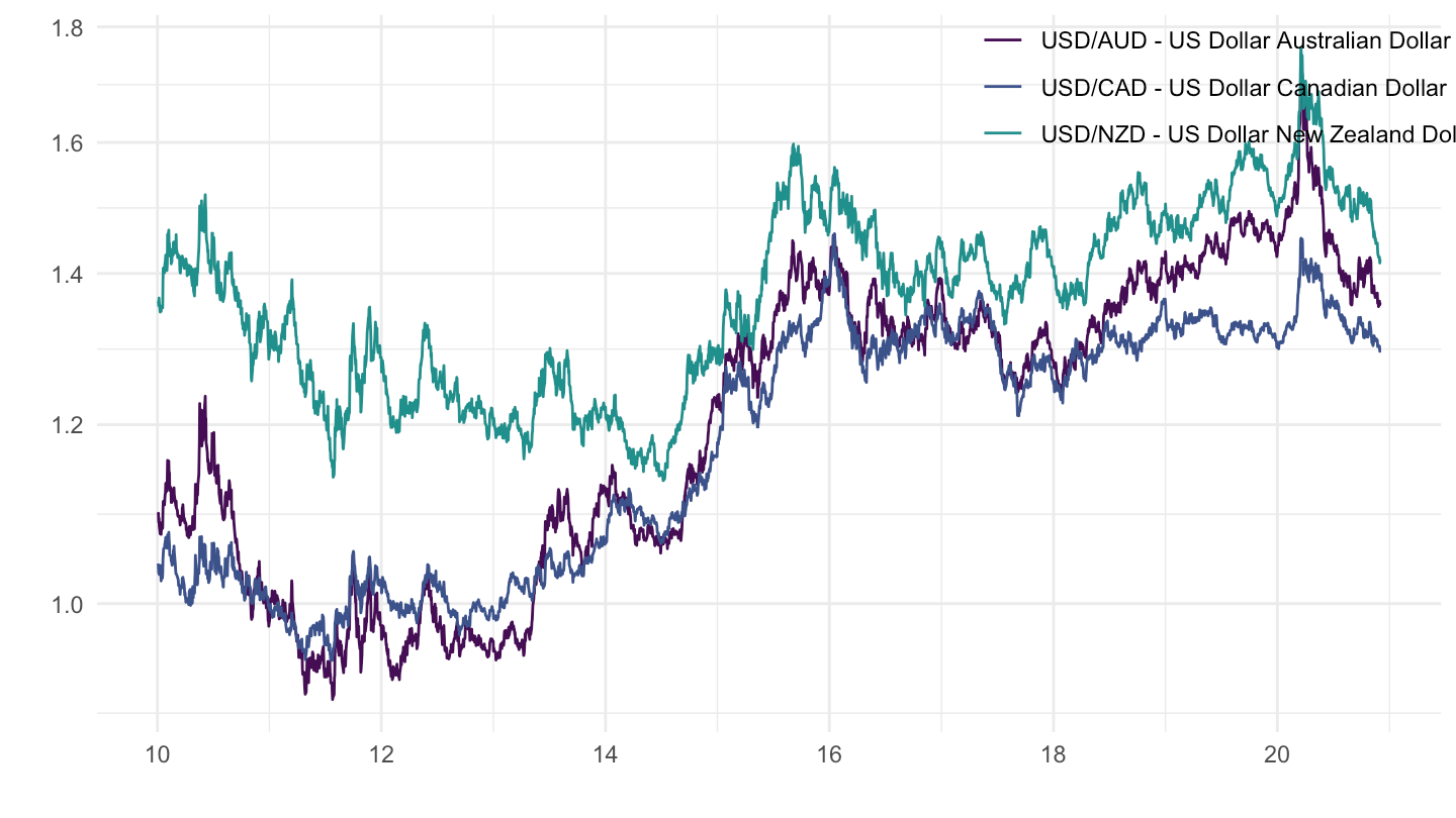 currency_crosses_USD filter(Currency %in% c("AUD", "NZD", "CAD")) %>%