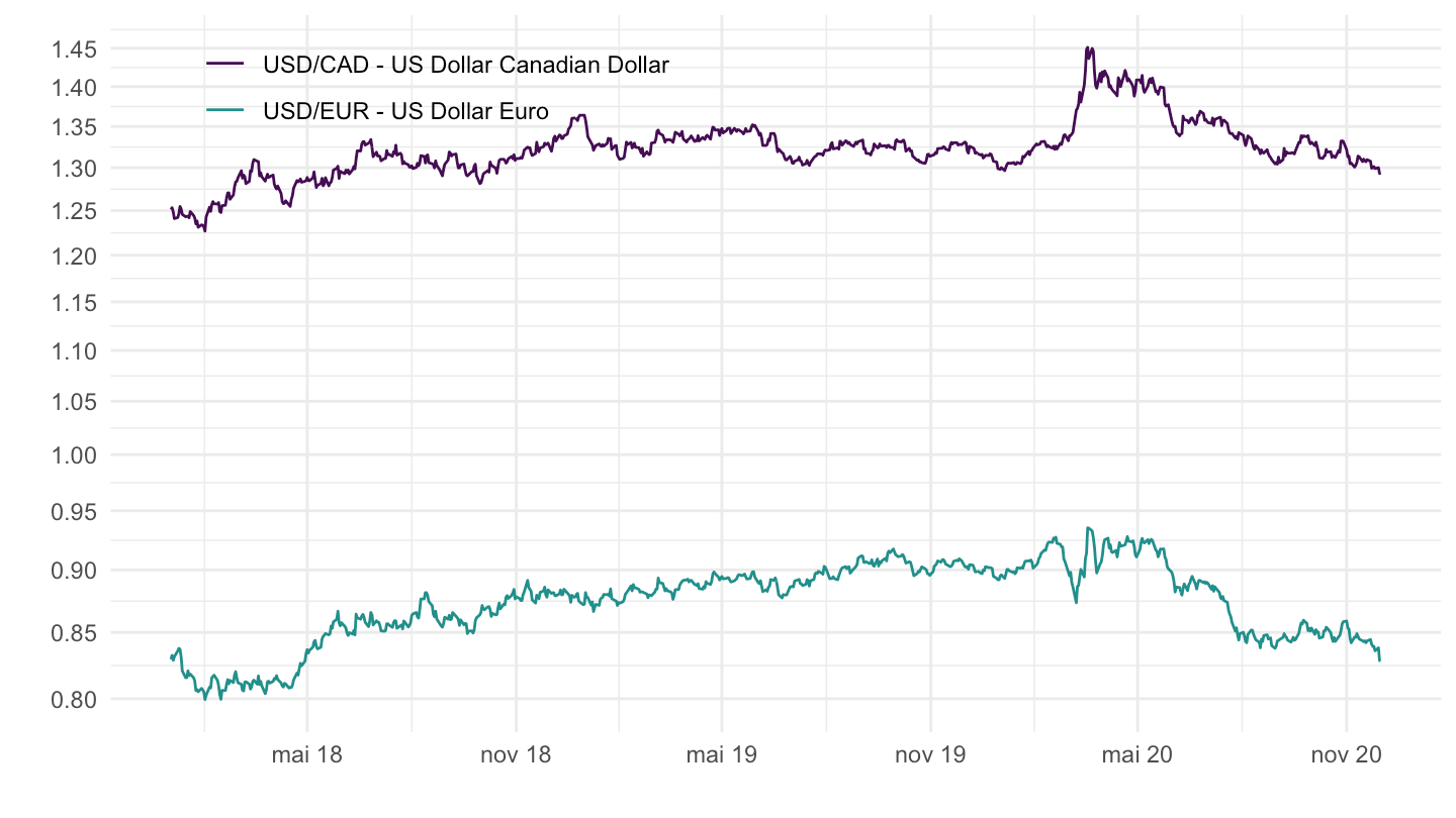 currency_crosses_USD filter(Currency %in% c("CAD", "EUR"),