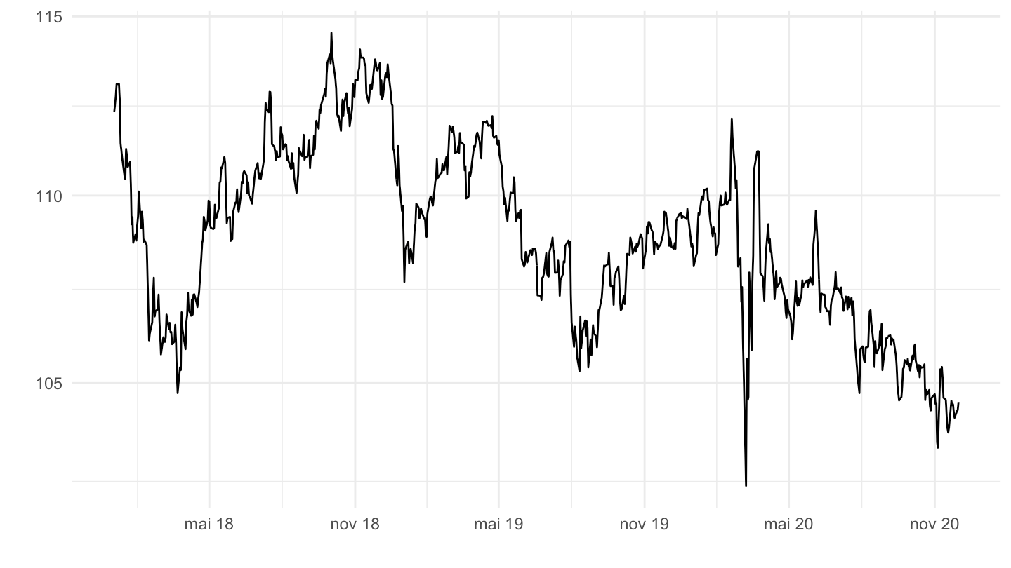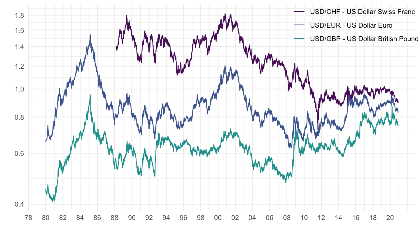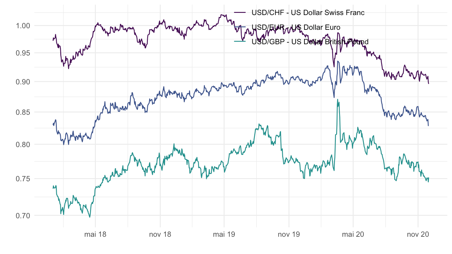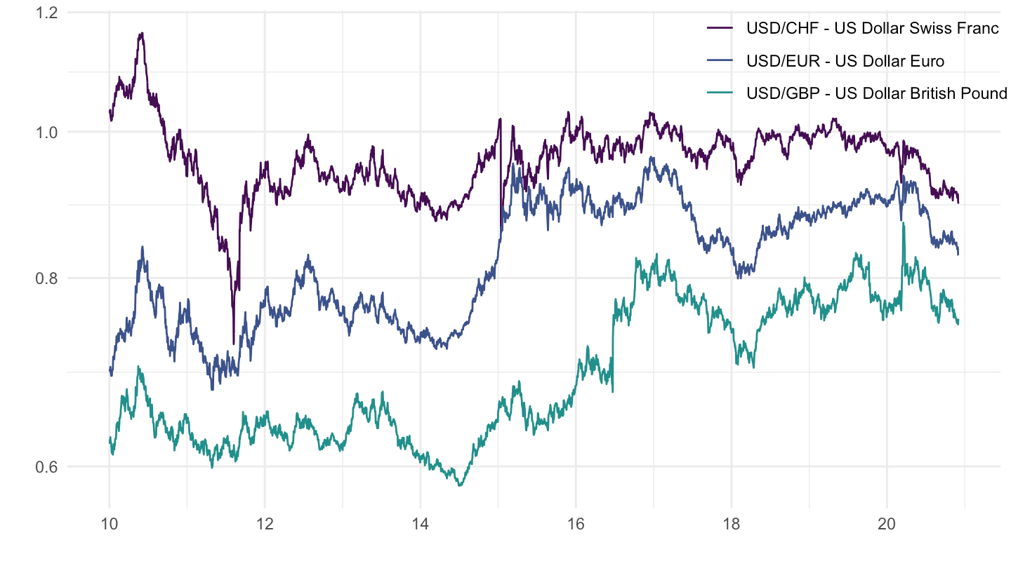 currency_crosses_USD filter(Currency %in% c("EUR", "CHF", "GBP")) %>%