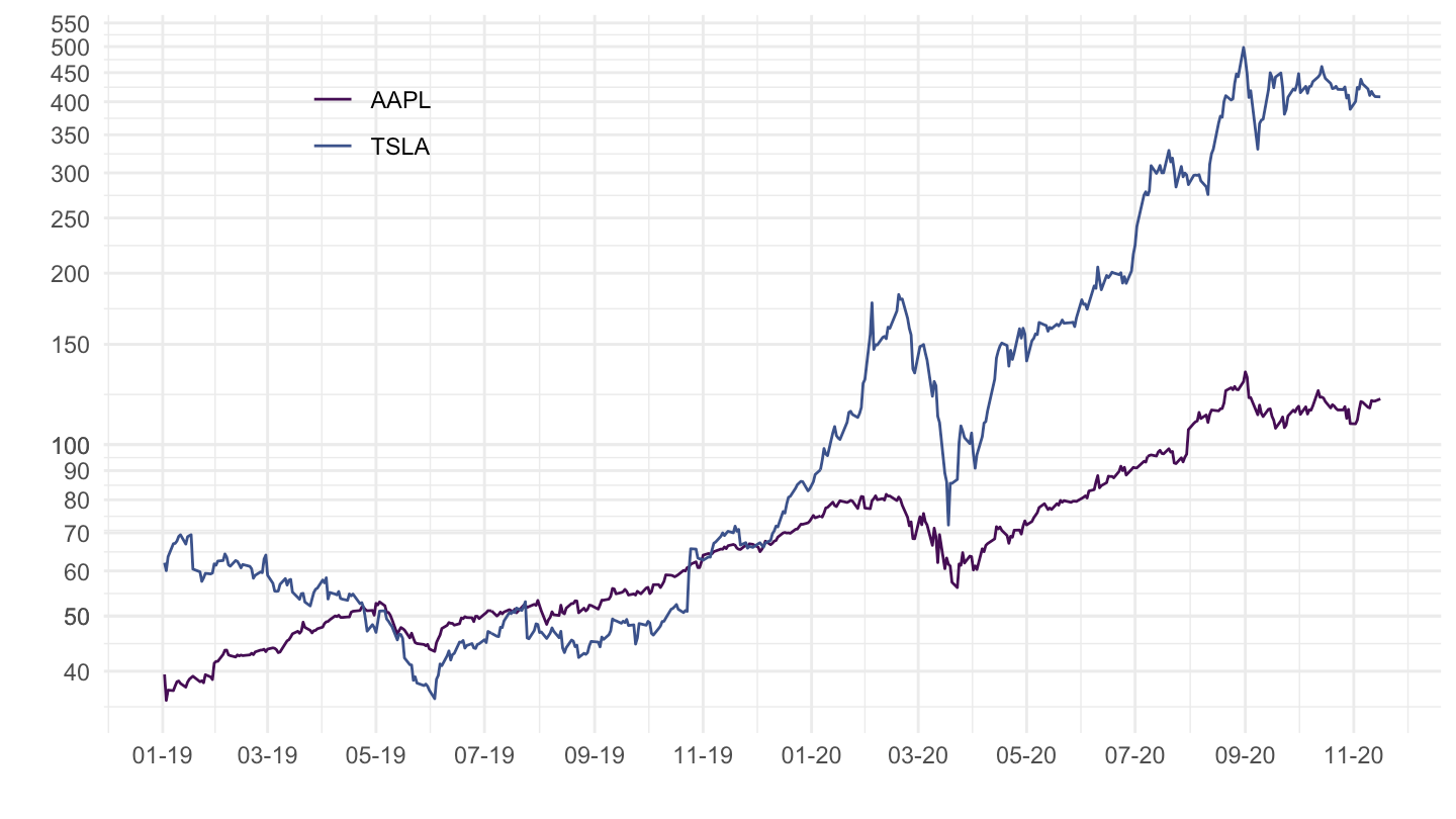 stocks_USA filter(symbol %in% c("TSLA", "AAPL"),