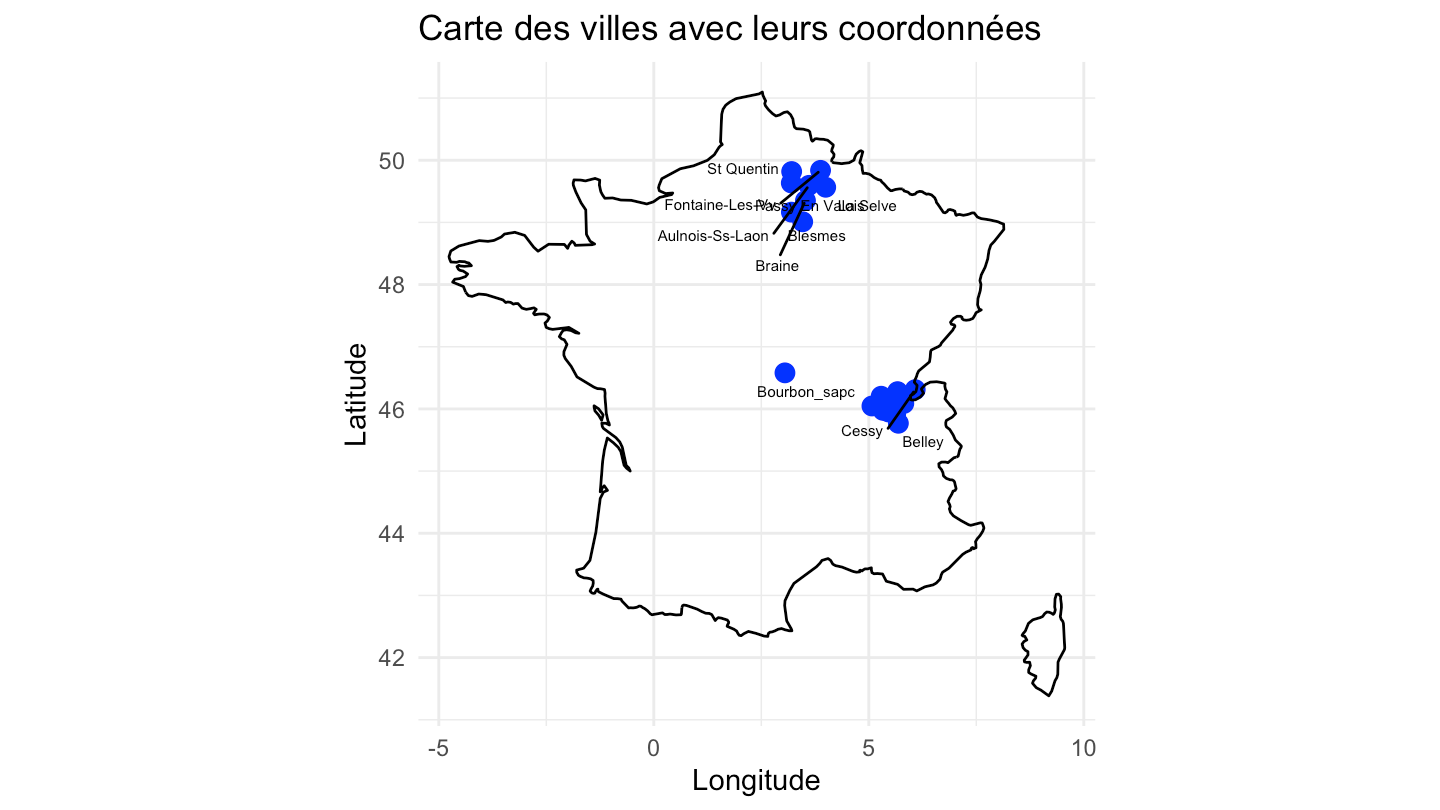 labs(title = "Carte des villes avec leurs coordonnées",