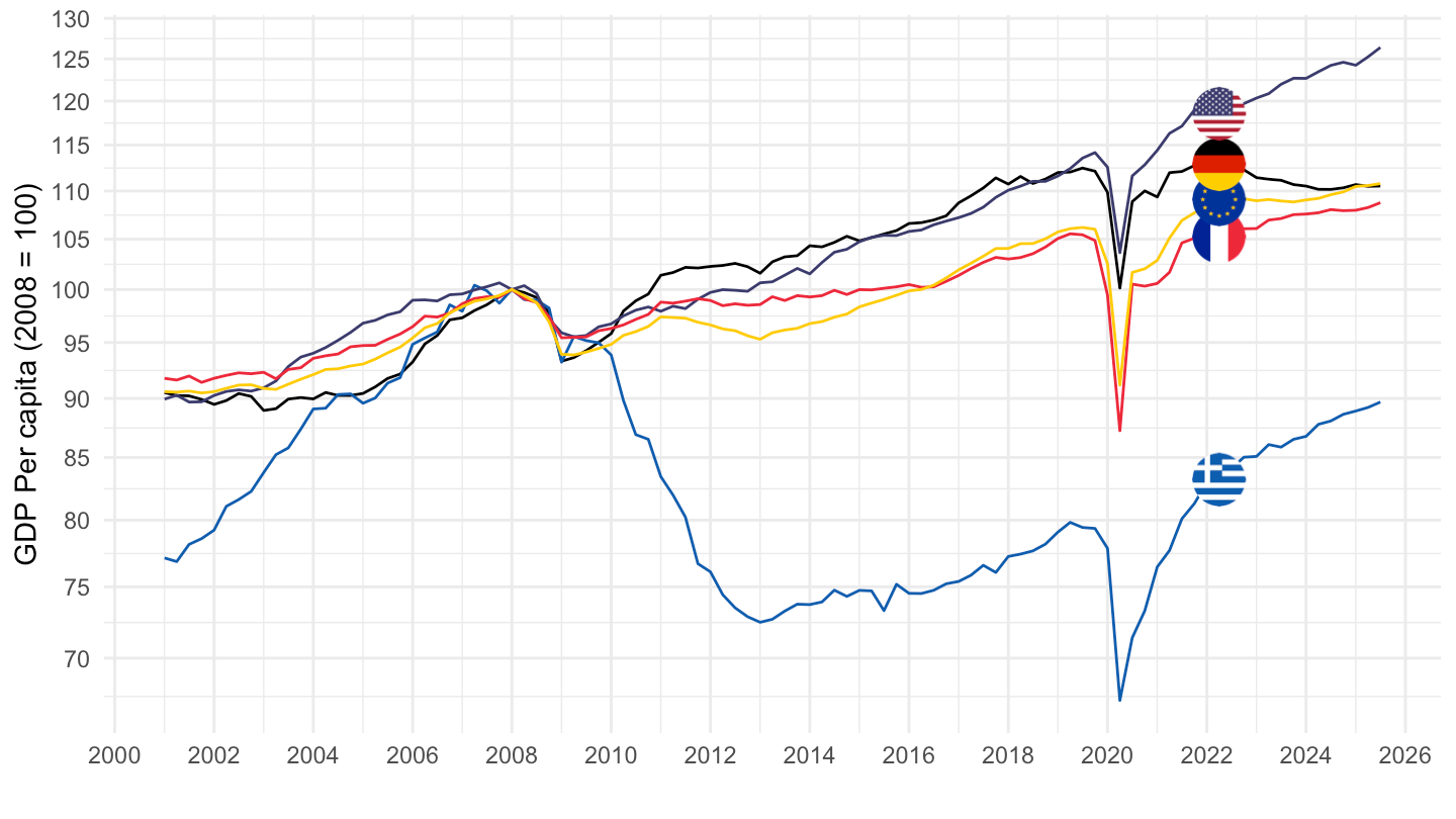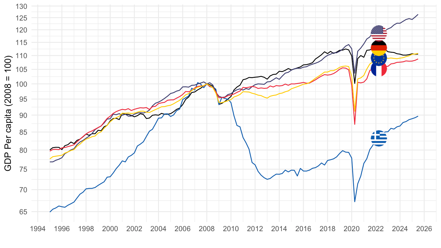 ggplot(.) + theme_minimal() + xlab("") + ylab("GDP Per capita (2008 = 100)") +