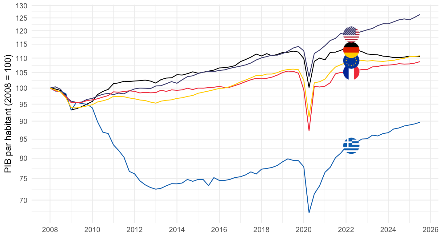 ggplot(.) + theme_minimal() + xlab("") + ylab("PIB par habitant (2008 = 100)") +