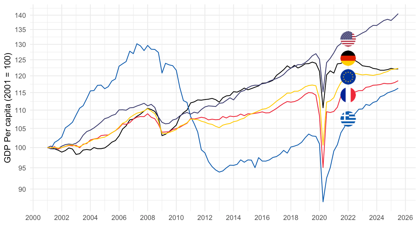 ggplot(.) + theme_minimal() + xlab("") + ylab("GDP Per capita (2001 = 100)") +