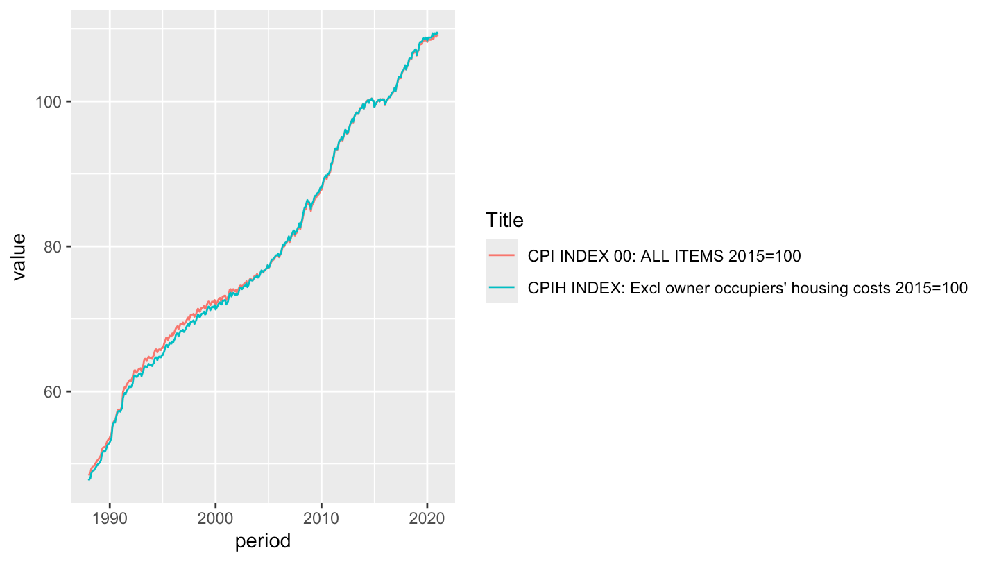ggplot + geom_line(aes(x = period, y = value, color = title))