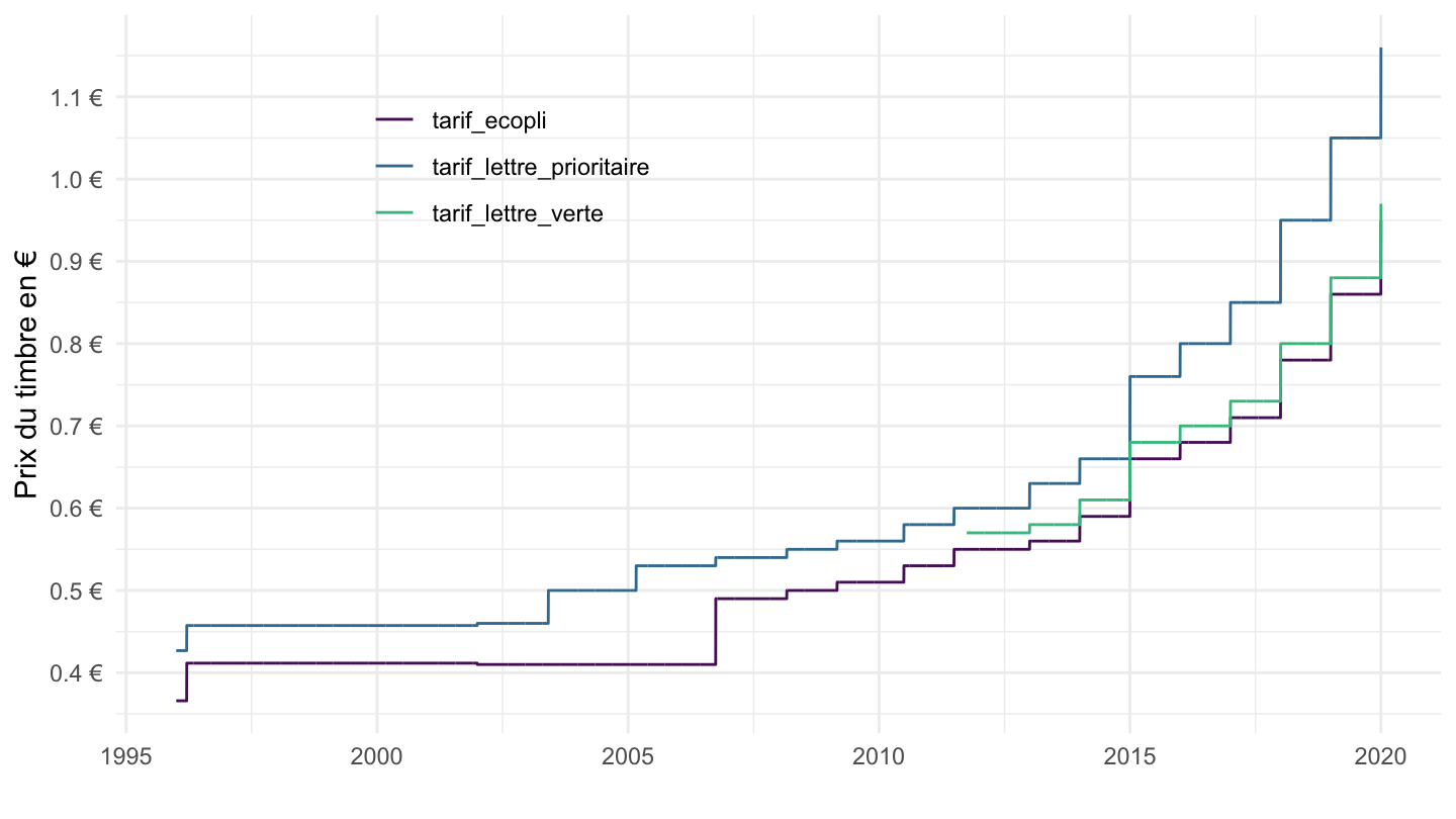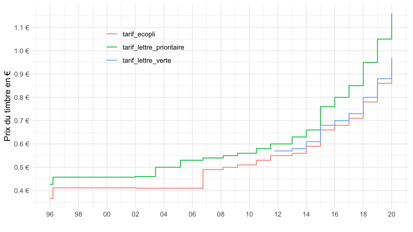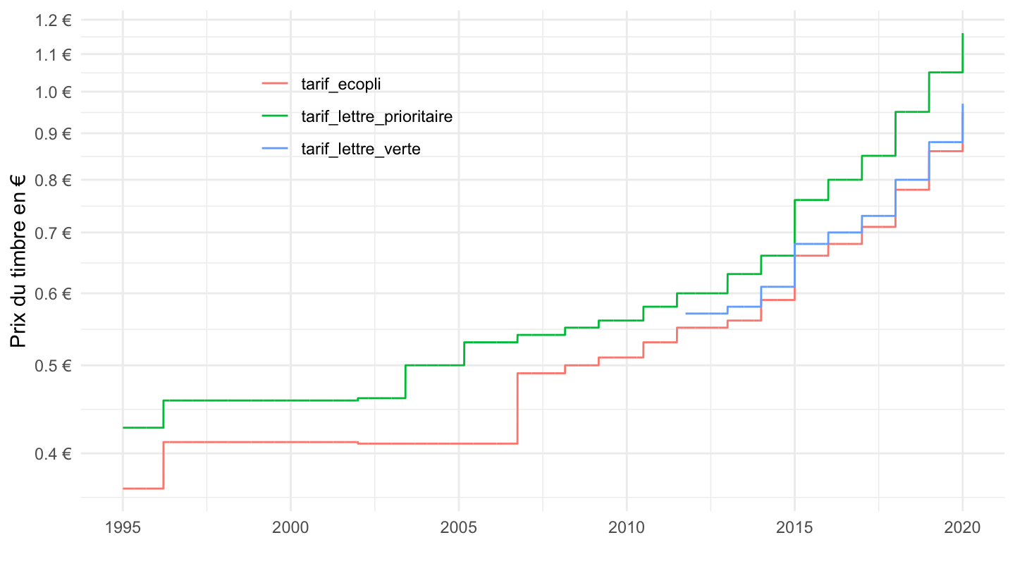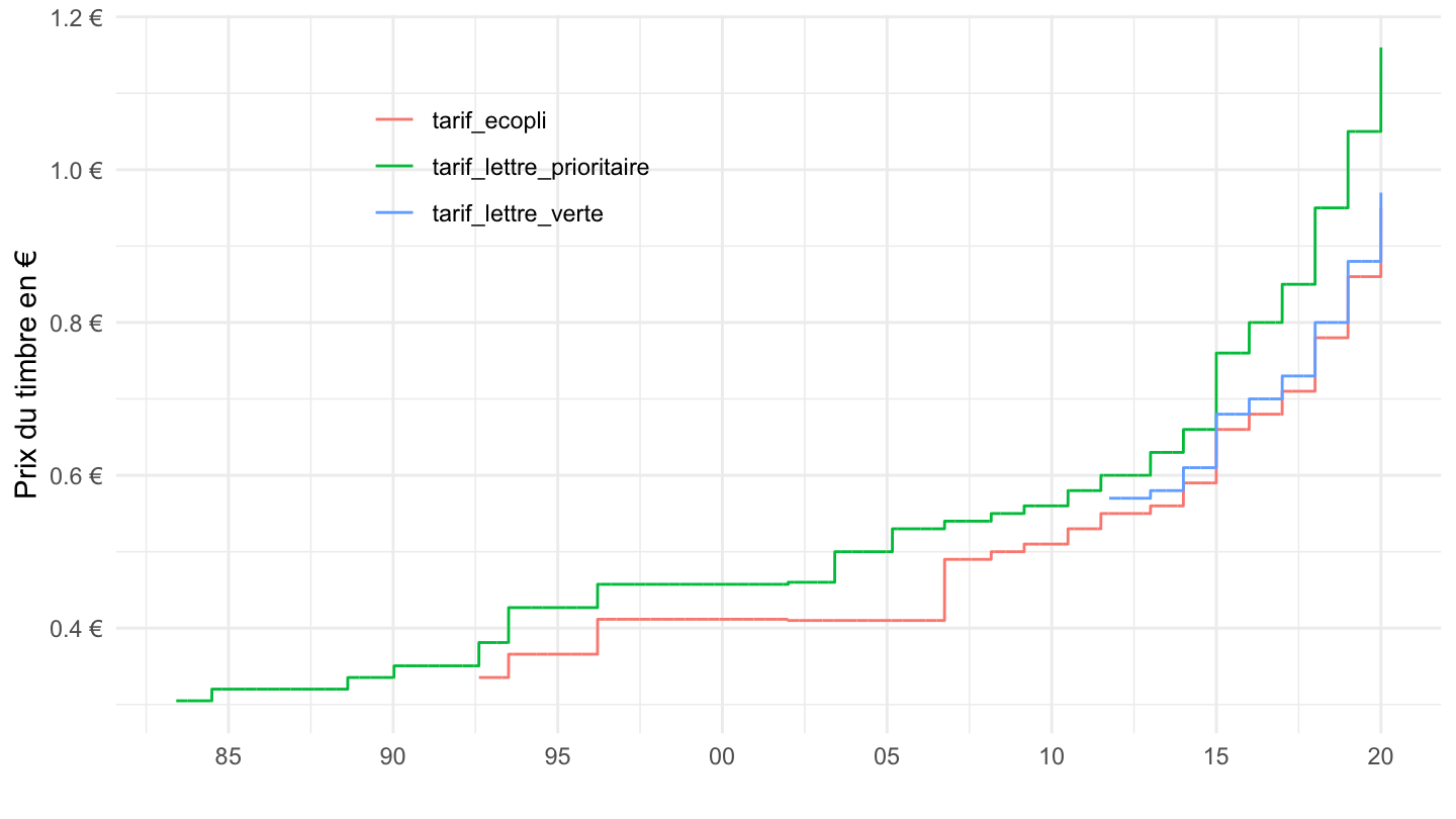 prix_timbre select(date = date_debut, tarif_lettre_prioritaire, tarif_ecopli) %>%