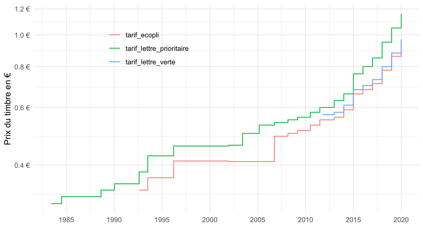 prix_timbre select(date = date_debut, tarif_lettre_prioritaire, tarif_lettre_verte, tarif_ecopli) %>%