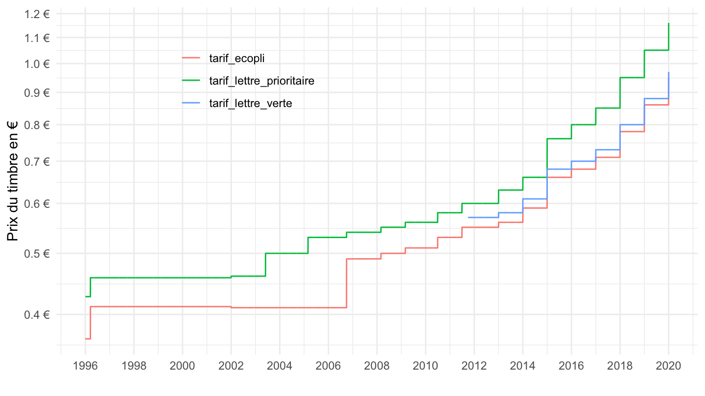 theme_minimal() + ylab("Prix du timbre en €") + xlab("") +