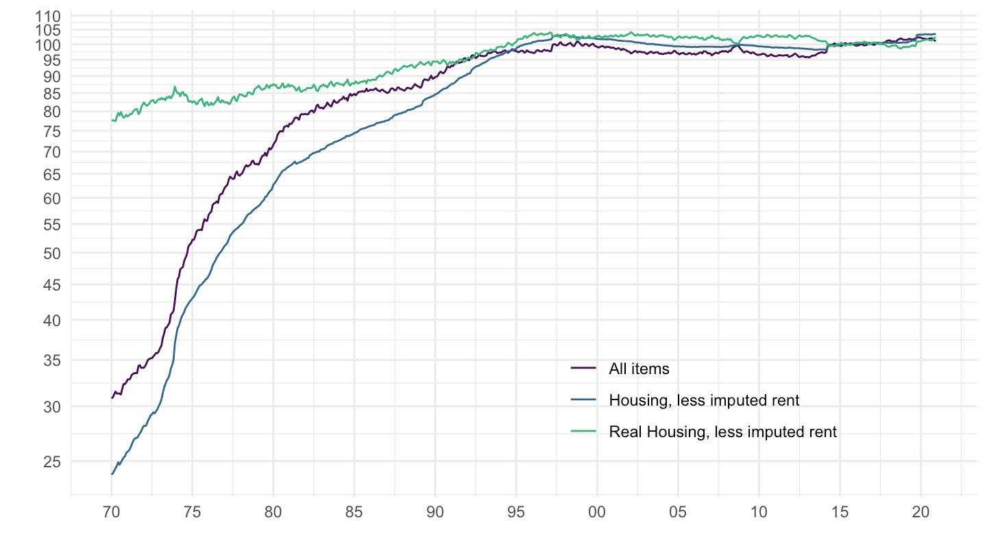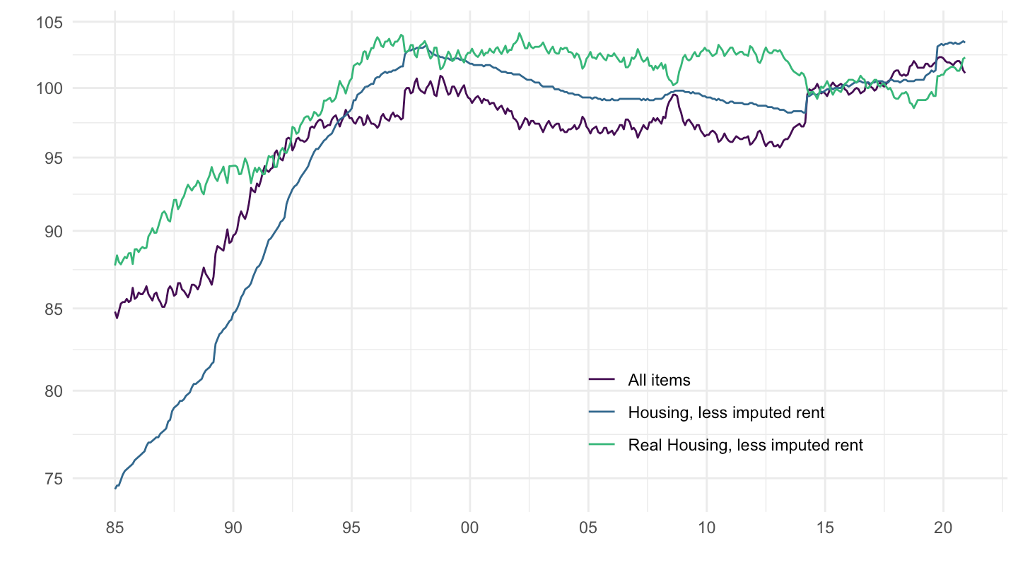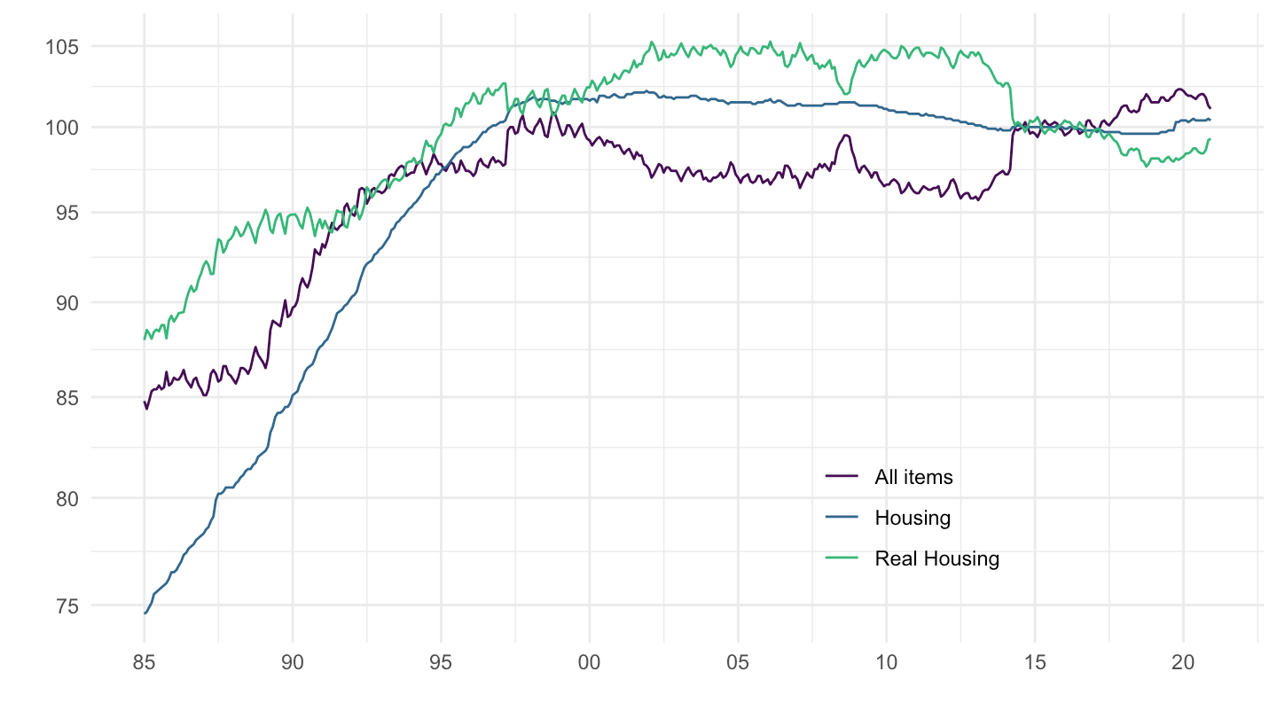 mutate(`Real Housing, less imputed rent` = 100 * `Housing, less imputed rent` / `All items`) %>%