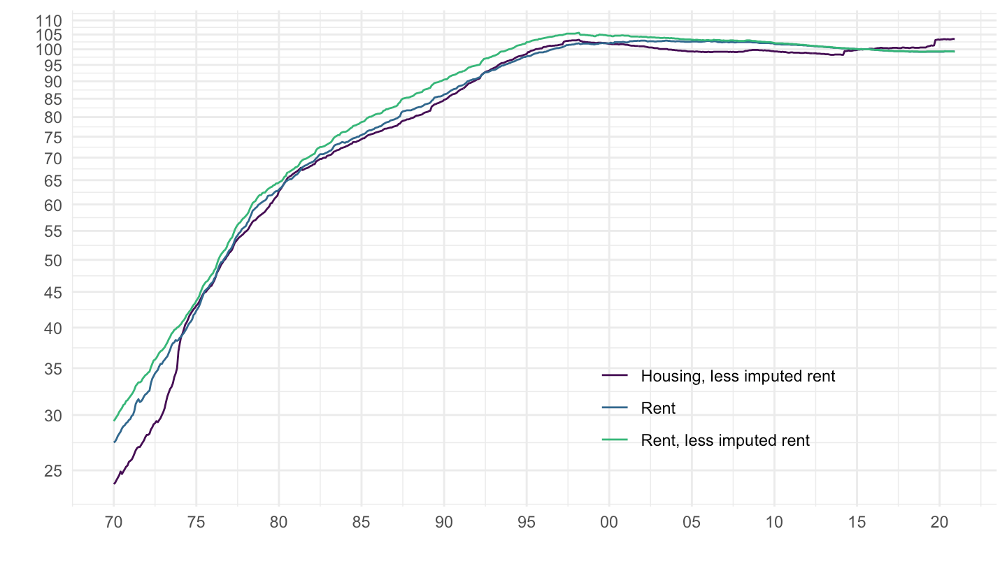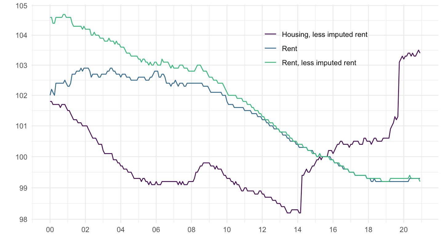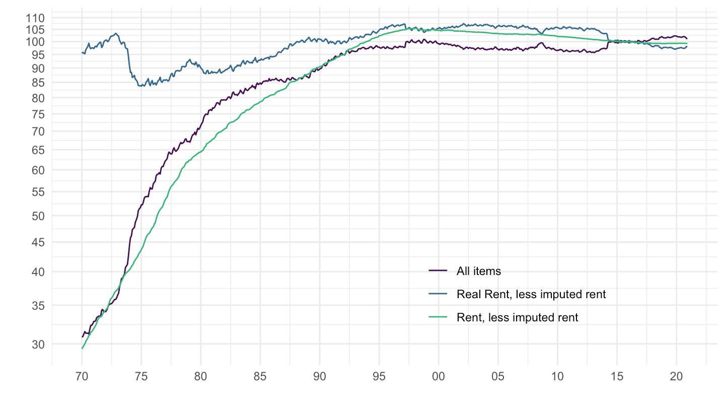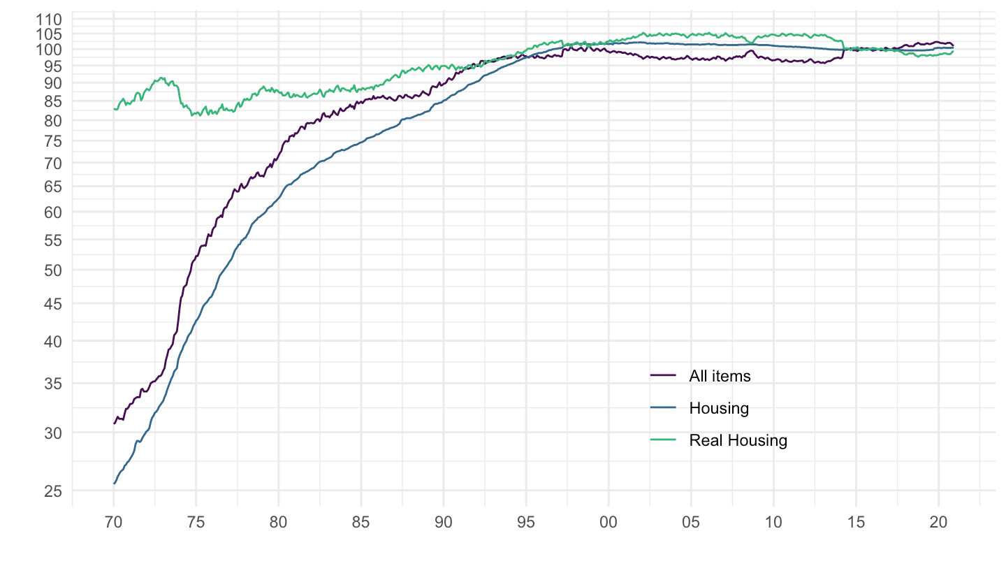 mutate(`Real Housing, less imputed rent` = 100 * `Housing, less imputed rent` / `All items`) %>%