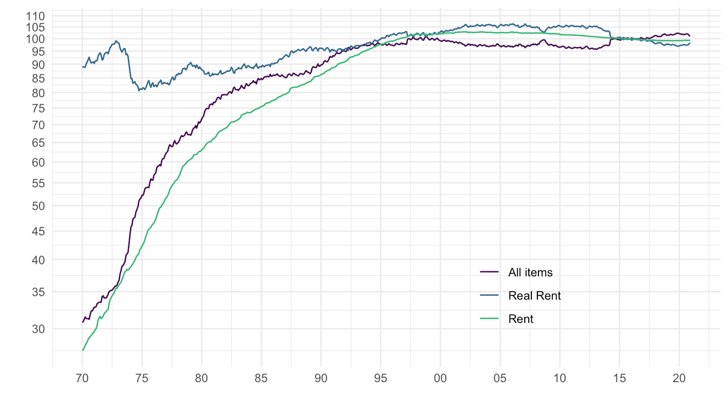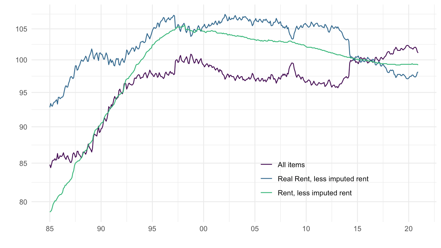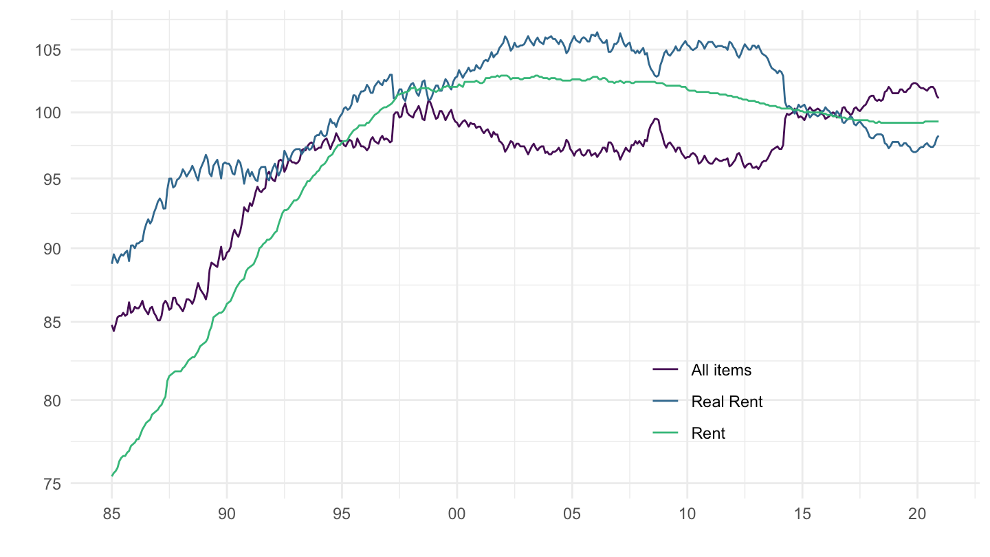 mutate(`Real Rent, less imputed rent` = 100 * `Rent, less imputed rent` / `All items`) %>%