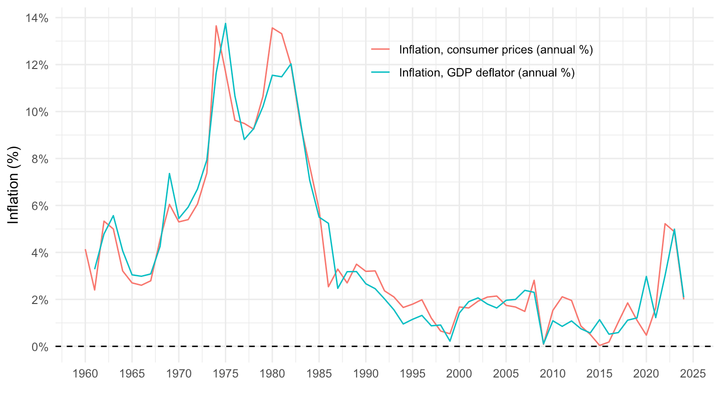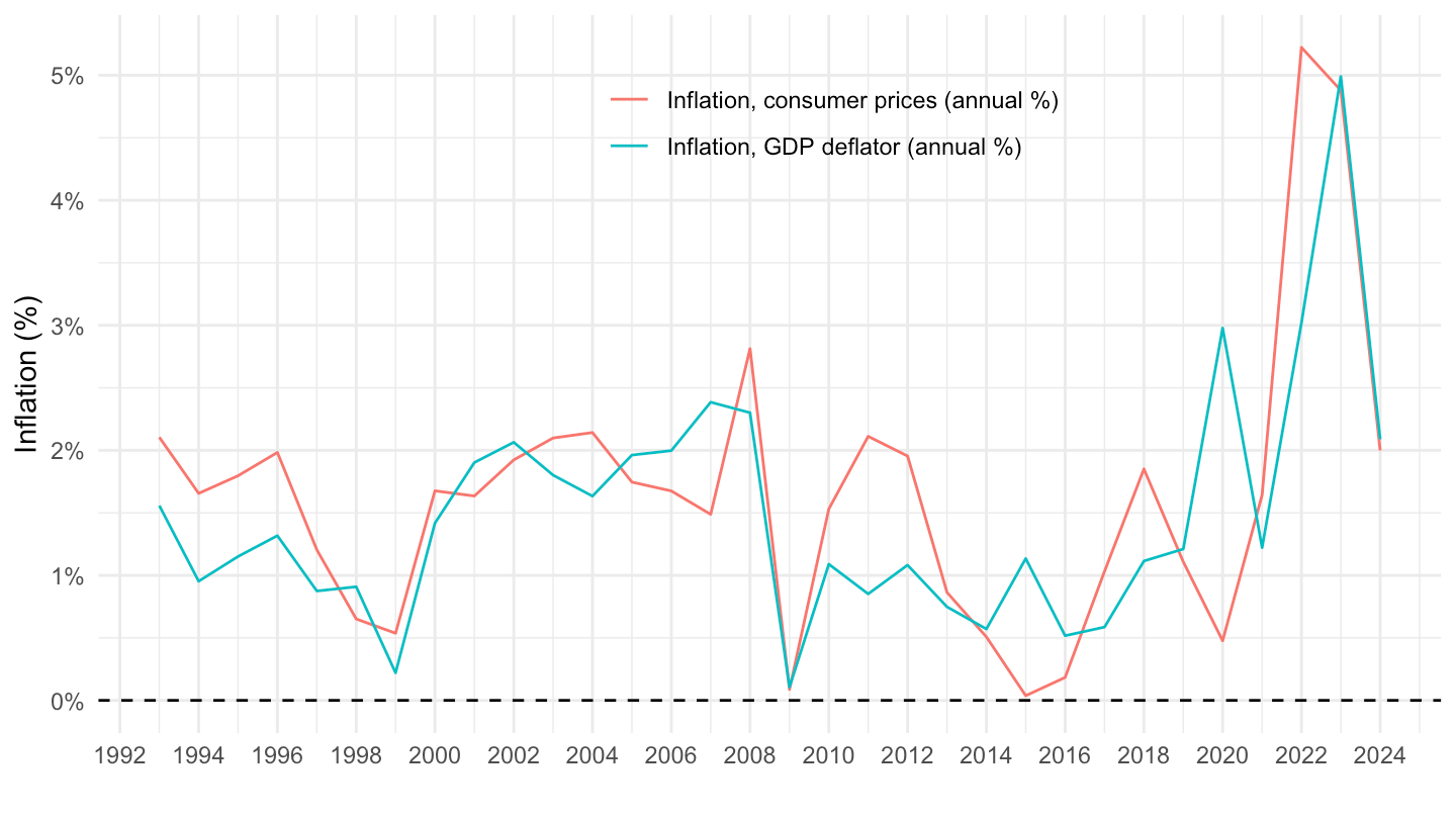 ggplot(.) + theme_minimal() + xlab("") + ylab("Inflation (%)") +
