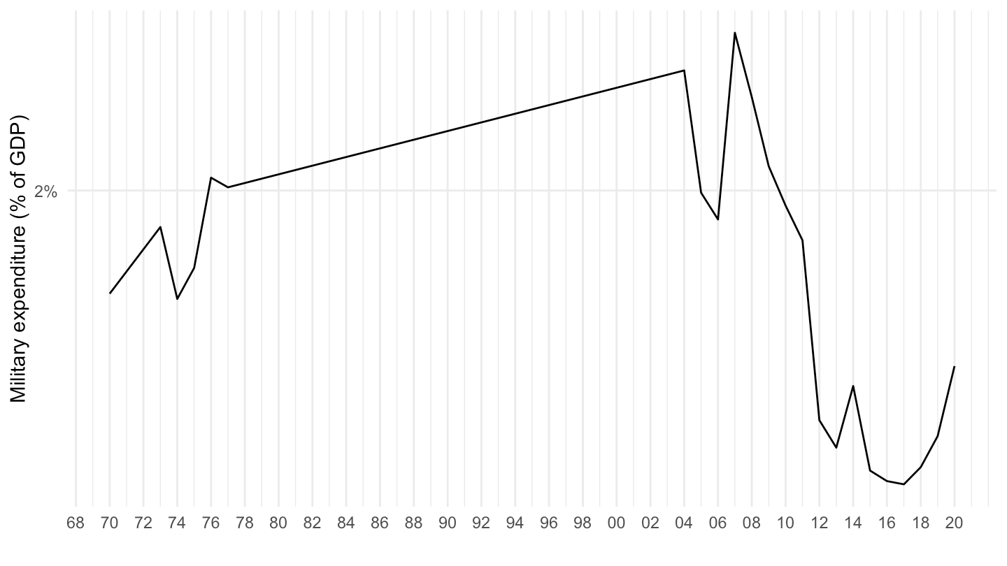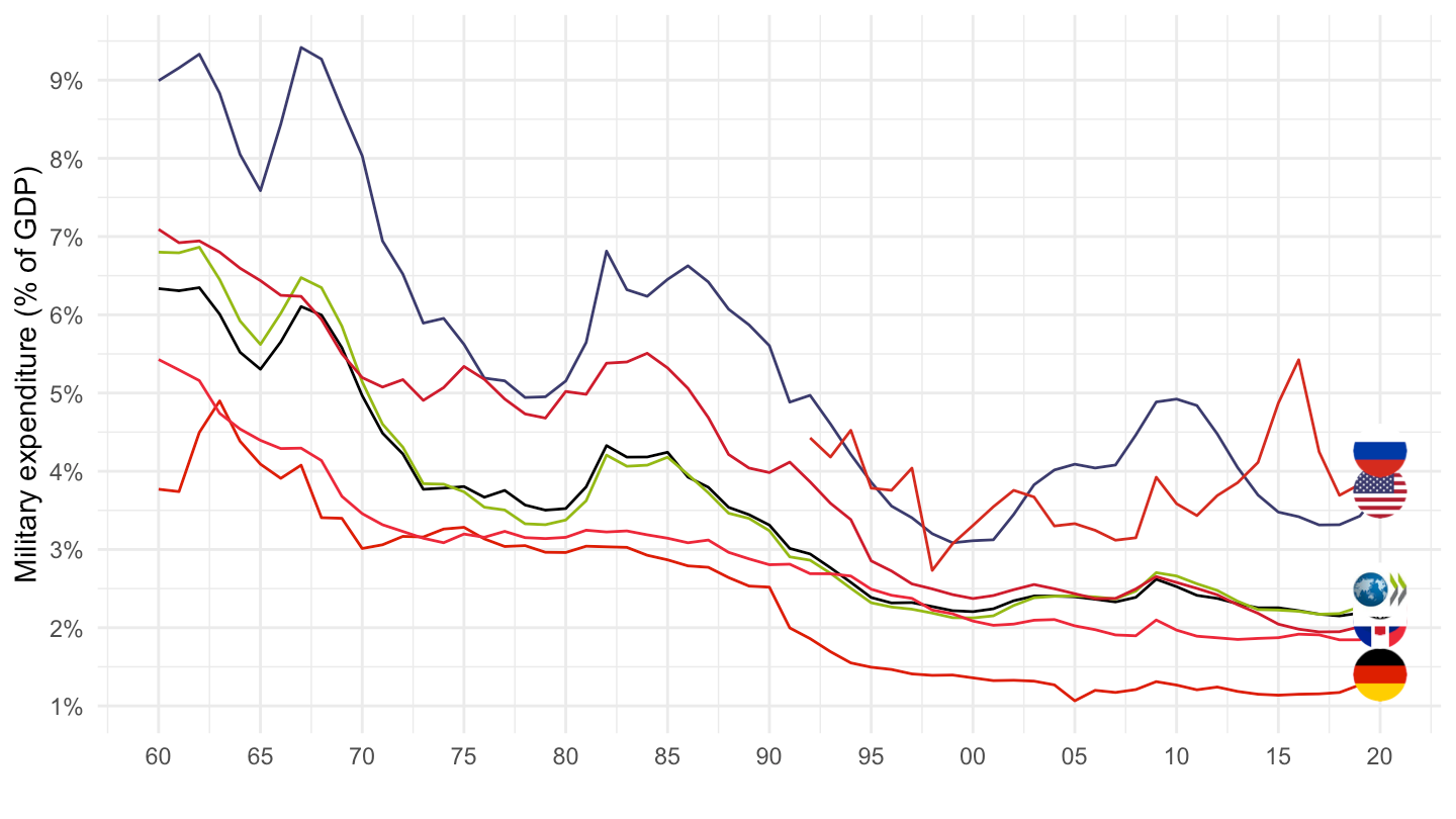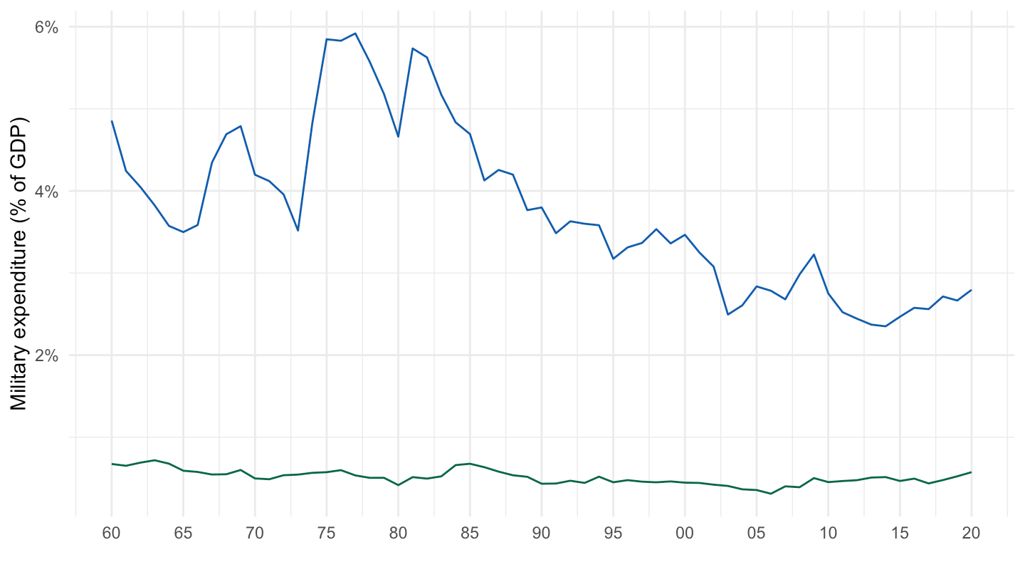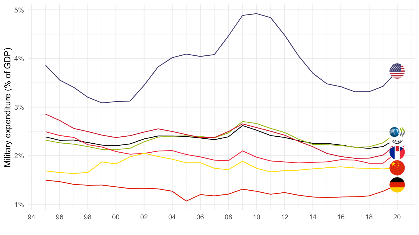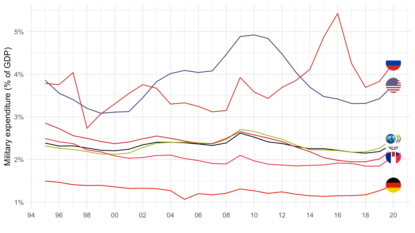 ggplot(.) + xlab("") + ylab("Military expenditure (% of GDP)") +
