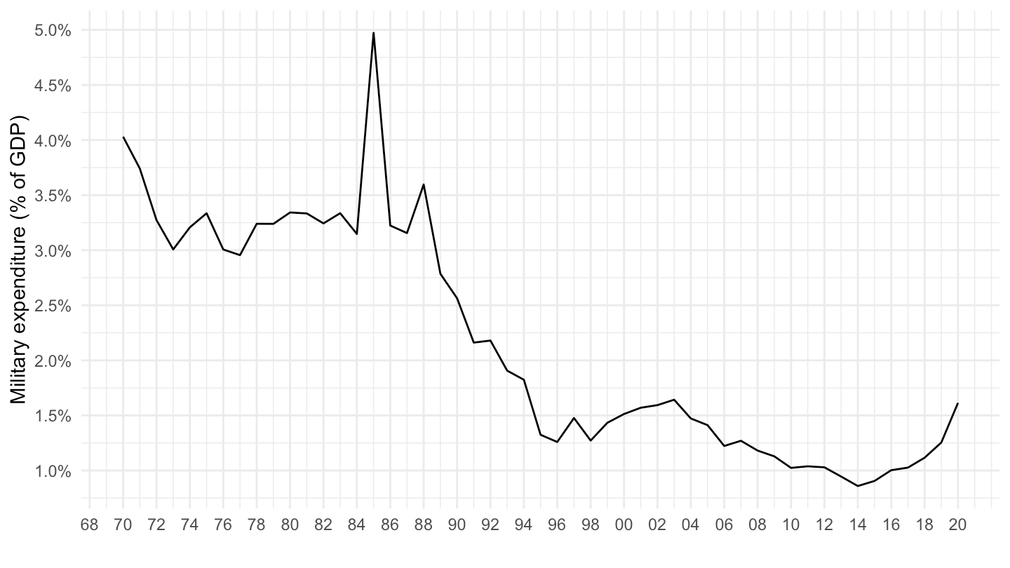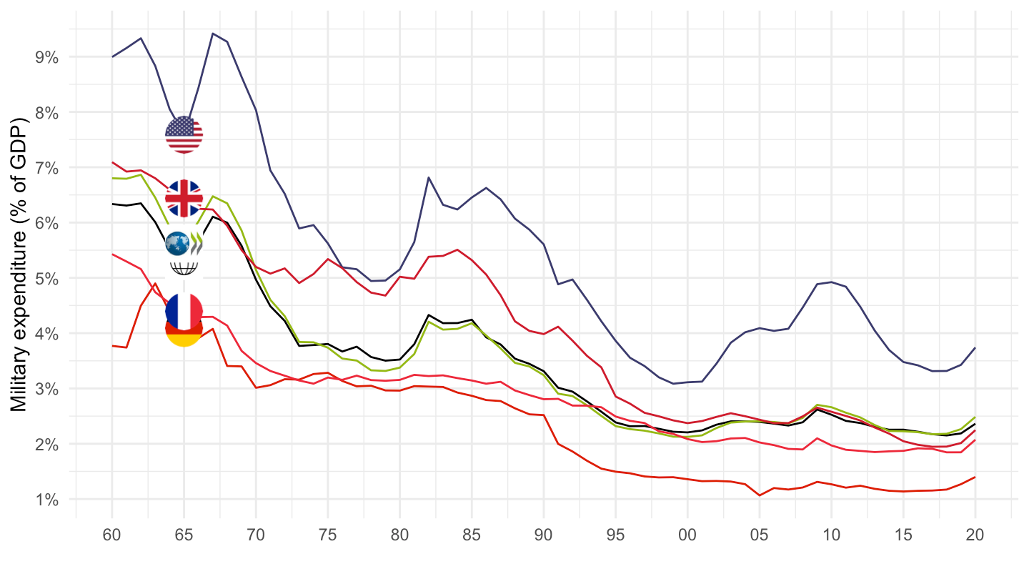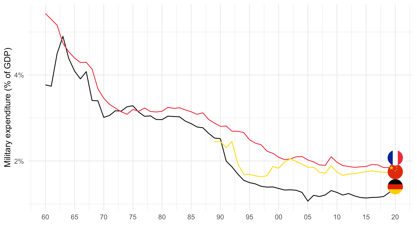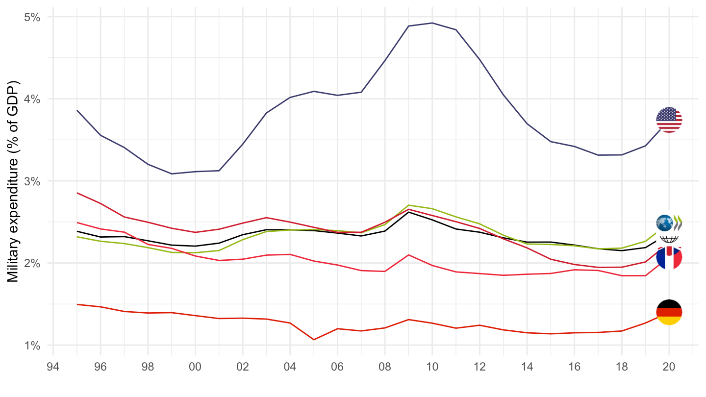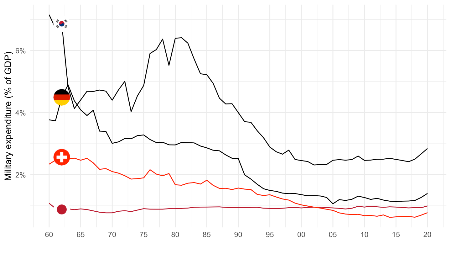 ggplot(.) + xlab("") + ylab("Military expenditure (% of GDP)") +
