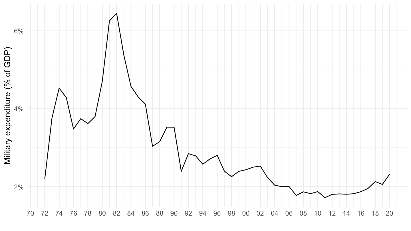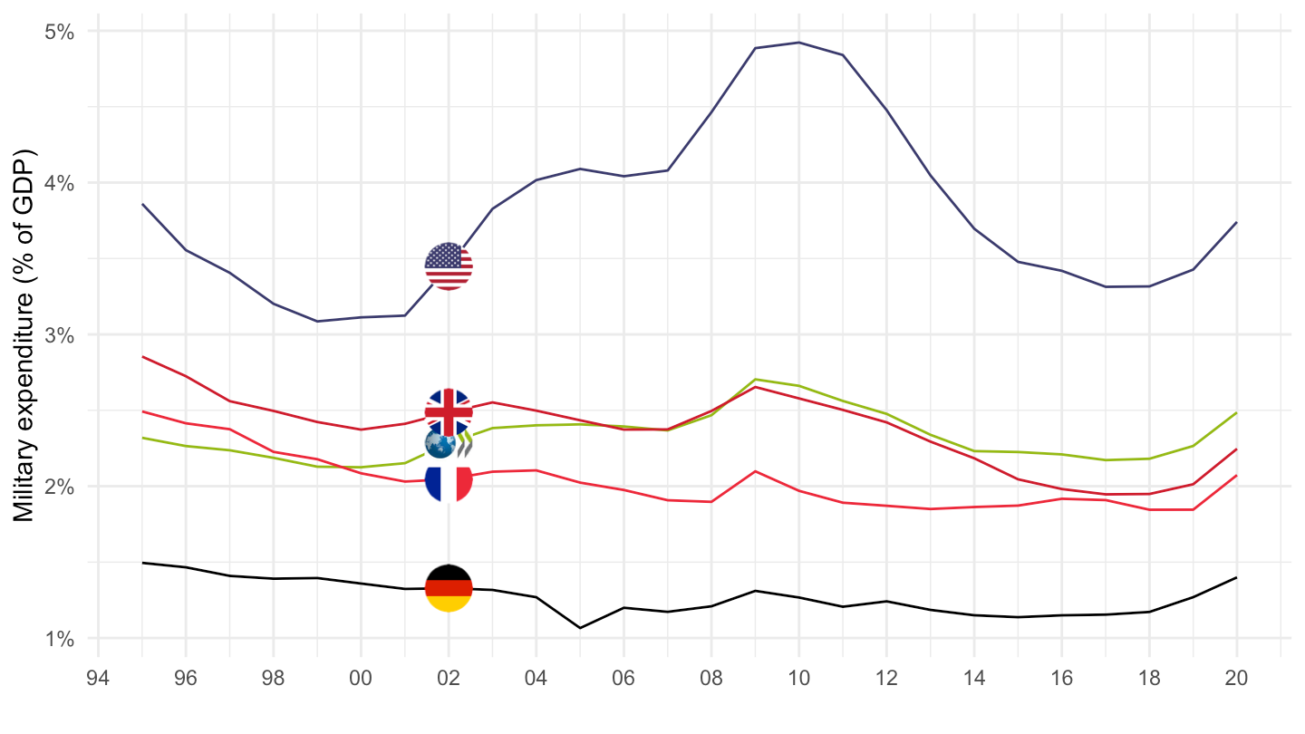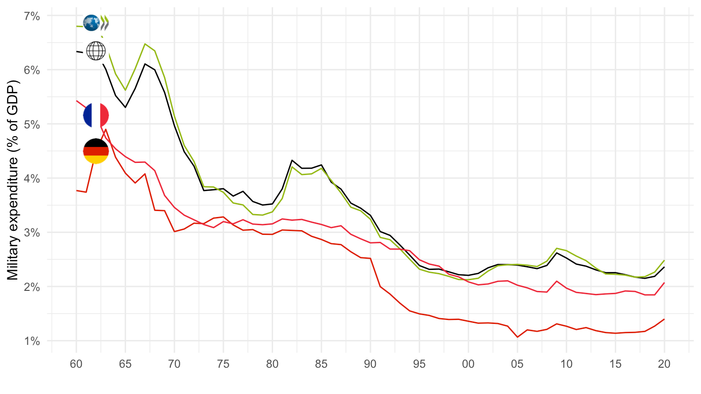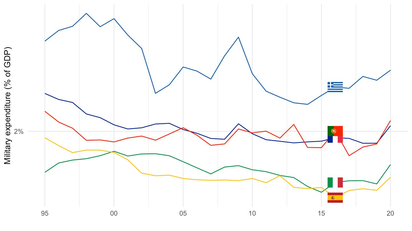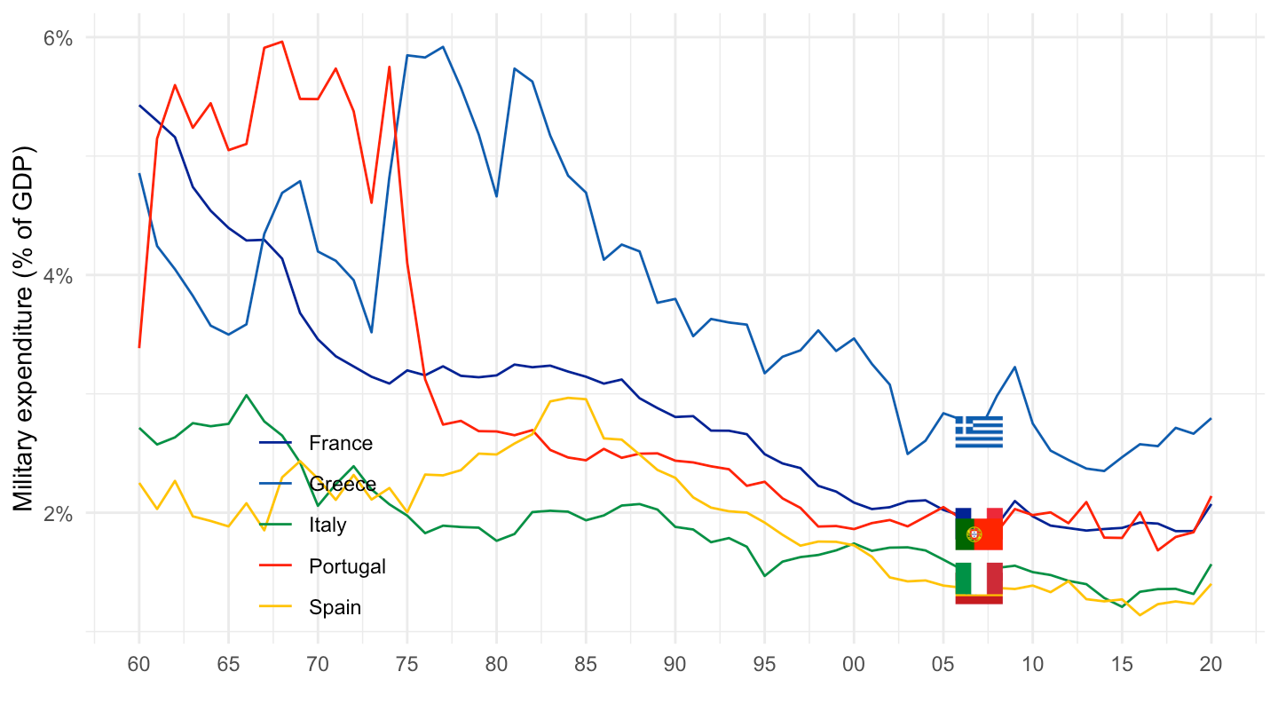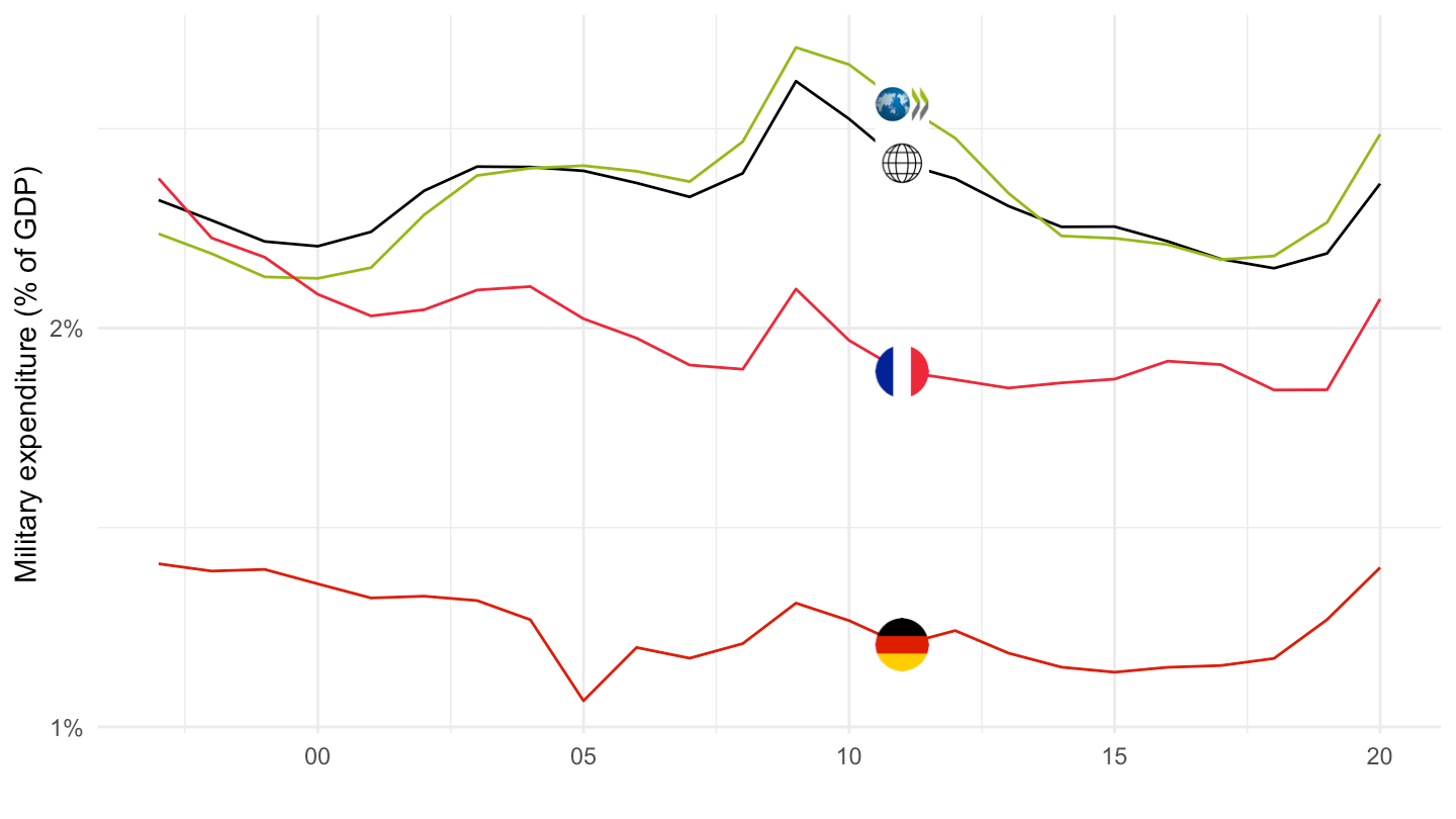 ggplot(.) + xlab("") + ylab("Military expenditure (% of GDP)") +