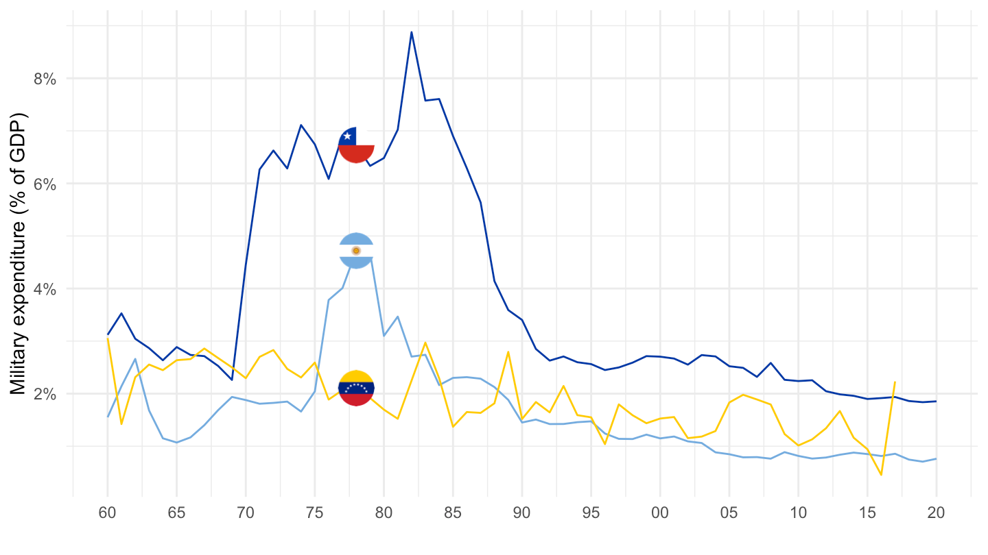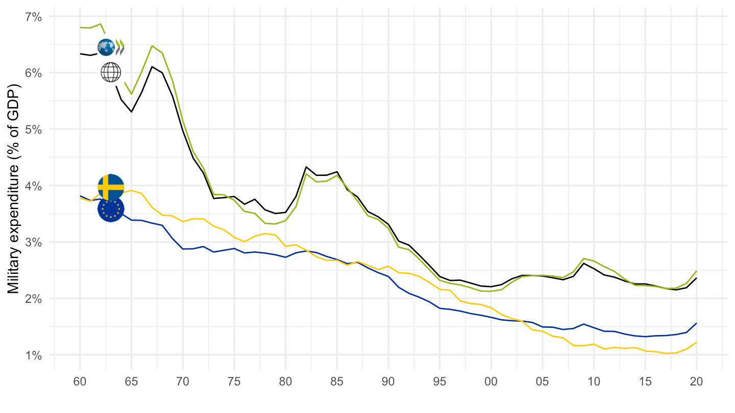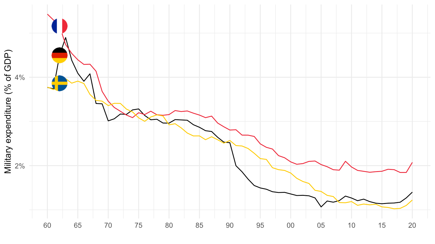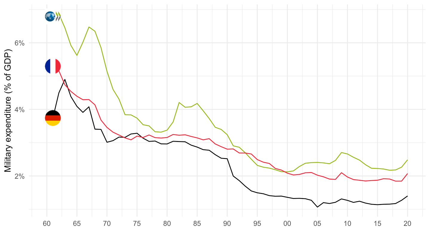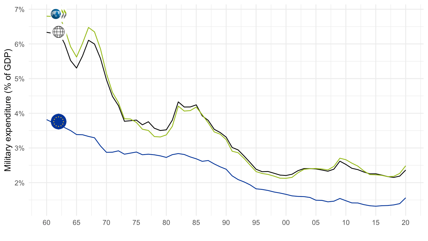 ggplot(.) + xlab("") + ylab("Military expenditure (% of GDP)") +
