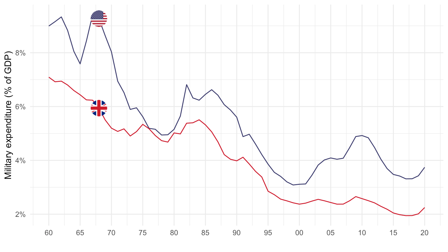 xlab("") + ylab("Military expenditure (% of GDP)")