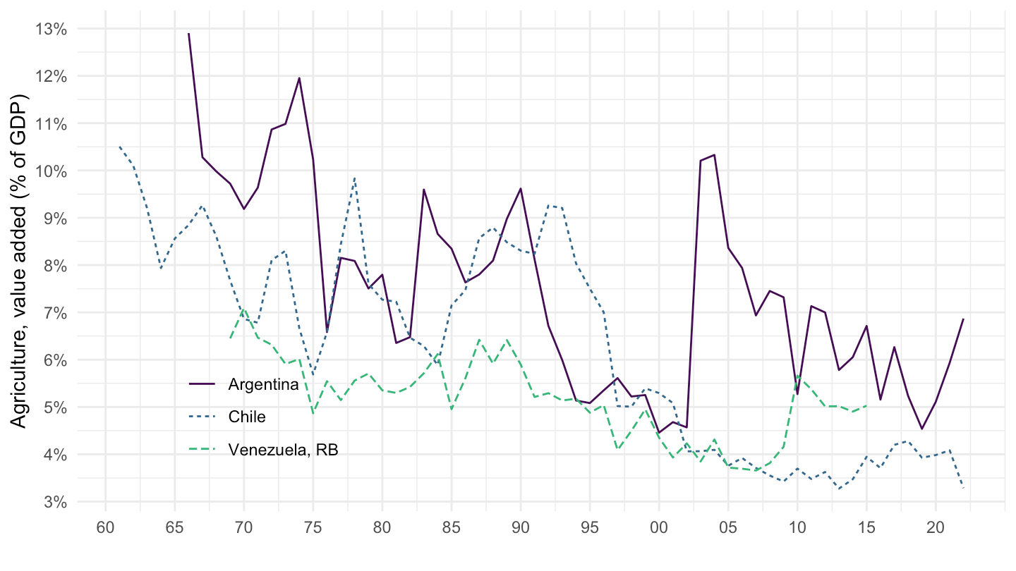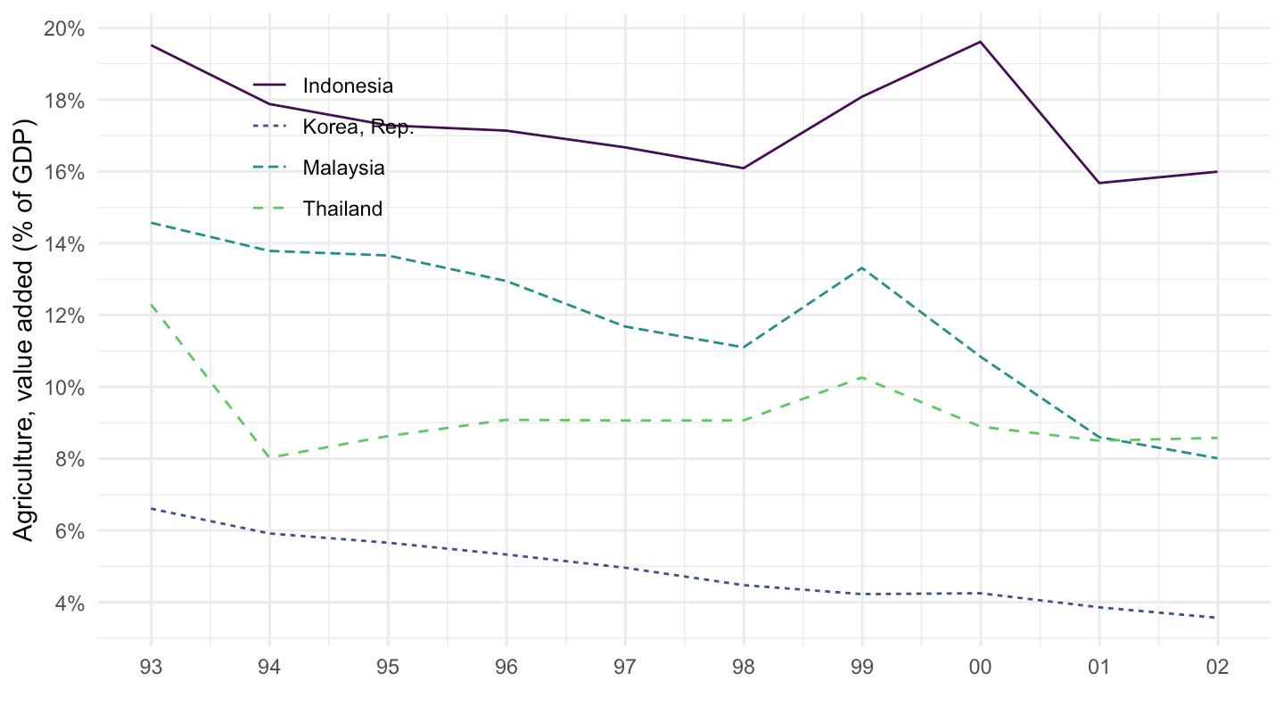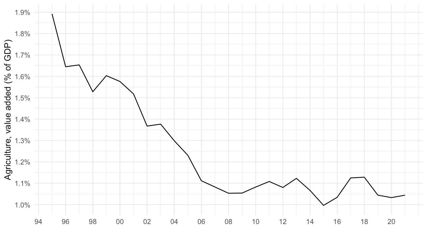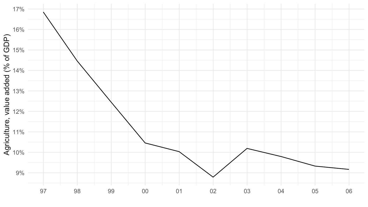 xlab("") + ylab("Agriculture, value added (% of GDP)") + theme_minimal() +