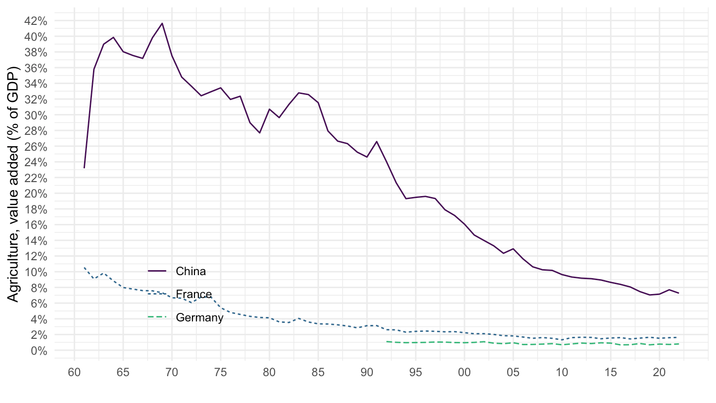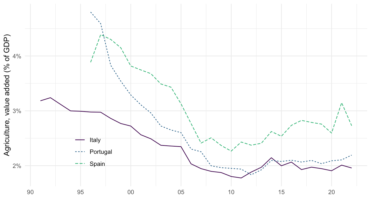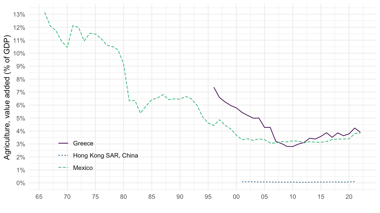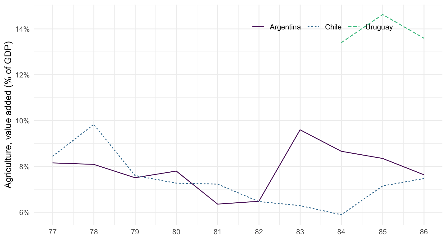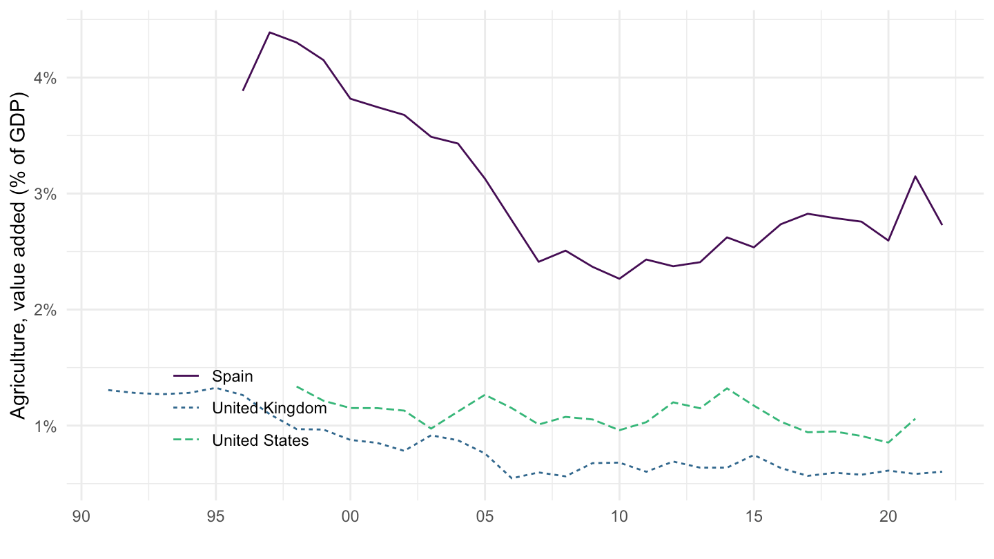 xlab("") + ylab("Agriculture, value added (% of GDP)") + theme_minimal() +