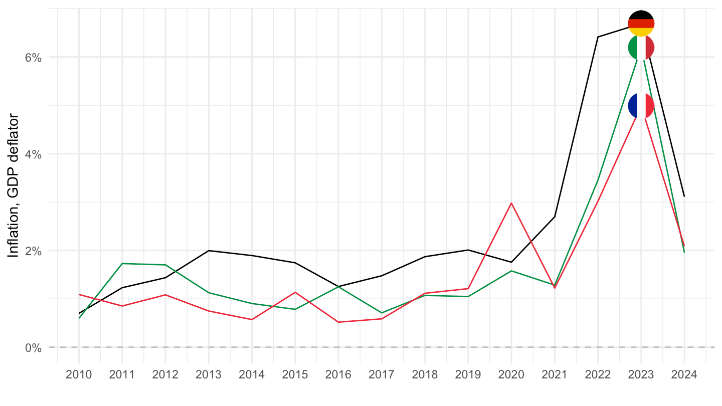 xlab("") + ylab("Inflation, GDP deflator") +