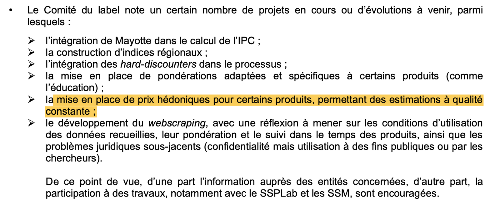 Davantage de données doivent être publiées par l’Insee: les méthodes d’ajustement qualité, notamment. Les mettre à la disposition des chercheurs indépendants et extérieurs à l’Insee et à l’administration, conformément au rapport Lenoir-Prot 1979, L’information économique et sociale, p. 142: « Des institut indépendants de l’administration doivent avoir accès comme elle aux statistiques de l’Insee. (…) On ne peut libérer les prix et retenir l’information. »