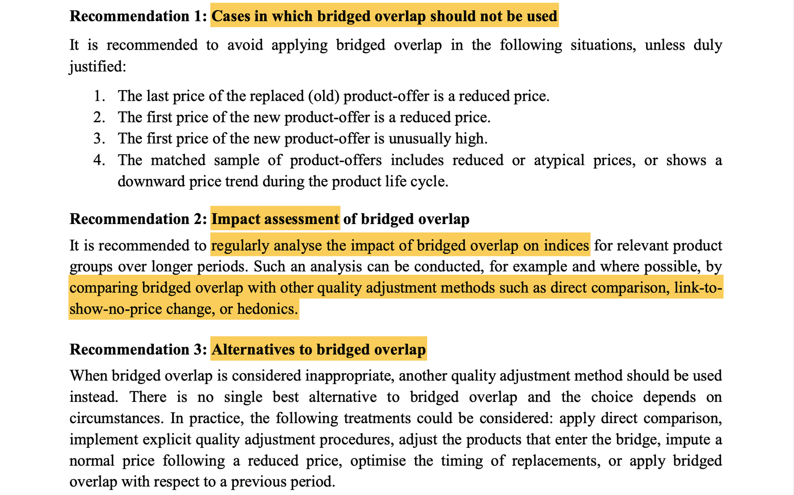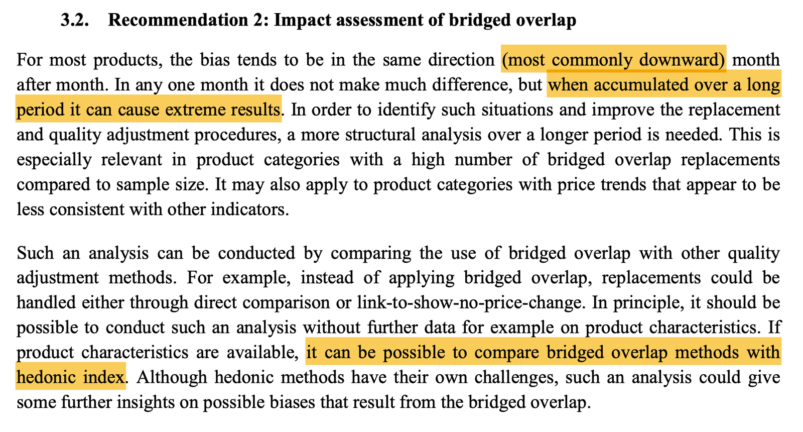 Des effets qualité surestimés par la méthode par bridged overlap, dont l’utilisation trop systématique est contraire aux recommandations Eurostat = « bonnes pratiques »,