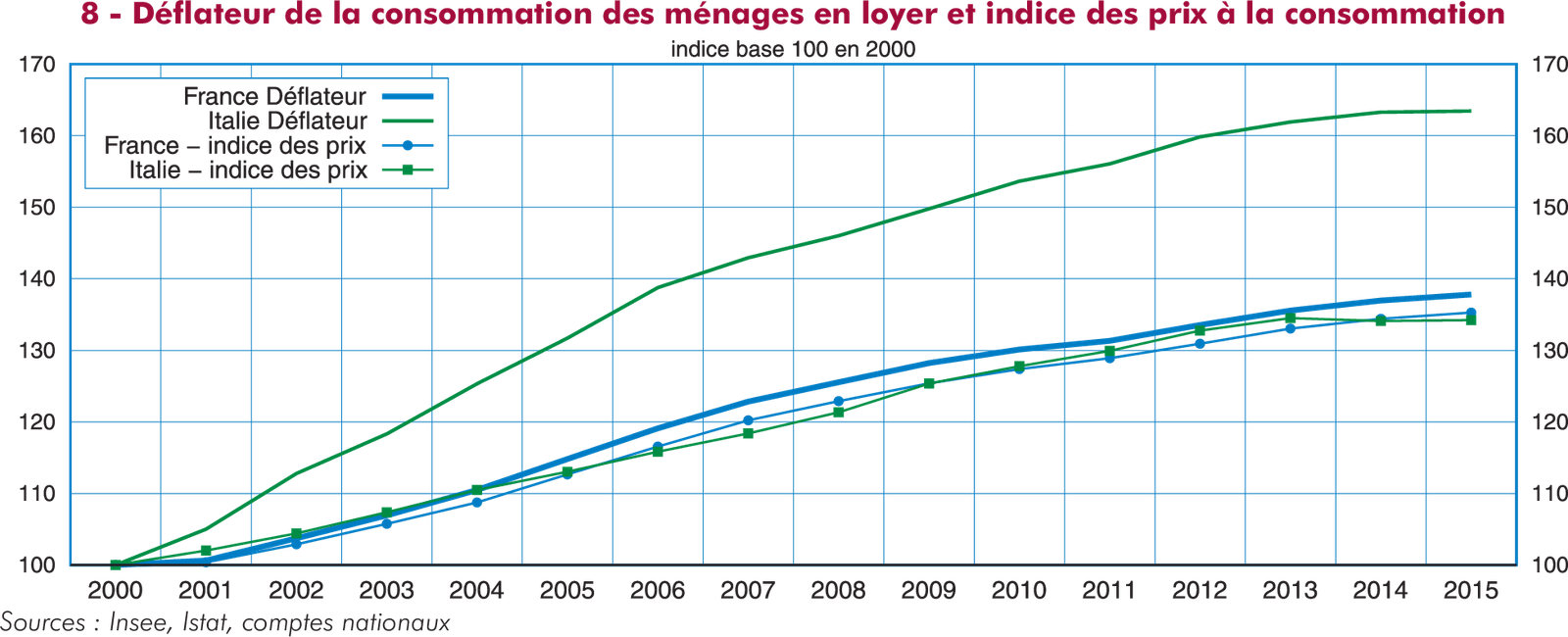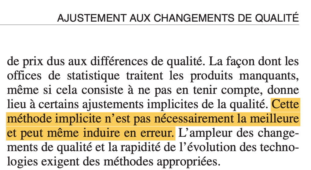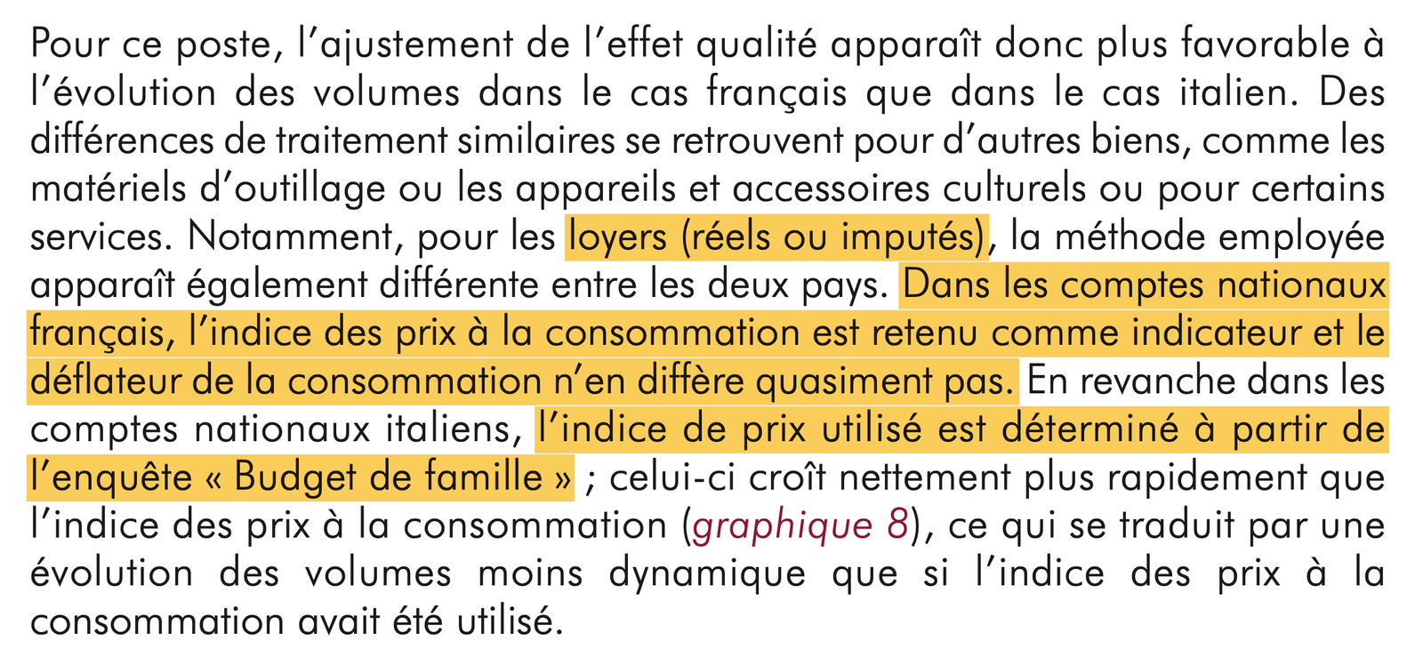 Le déflateur de la consommation sous-estime l’inflation: omission de l’investissement logement des ménages ; indice de Paasche ; effets qualité plus marqués en France qu’ailleurs en Europe = systématisation de la méthode par bridged overlap ne respecte pas les bonnes pratiques Eurostat.