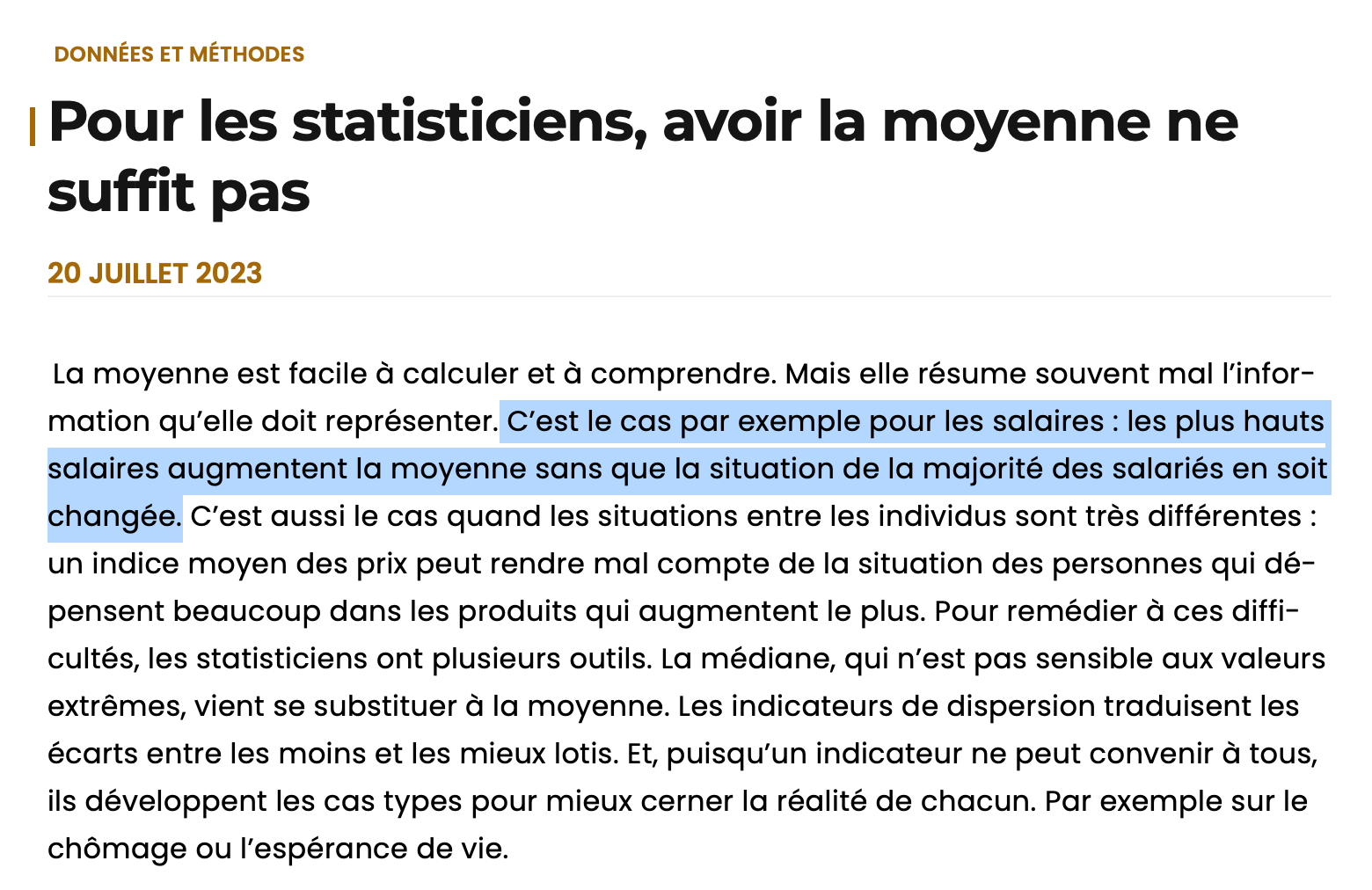 Pour les salaires, l’Insee publie systématiquement la médiane, précisément pour éviter cet effet - alors même que la queue de la distribution salariale est moins épaisse (coefficient de Pareto > 2). L’Insee a d’ailleurs consacré un billet de blog à ce problème de représentativité de la moyenne.