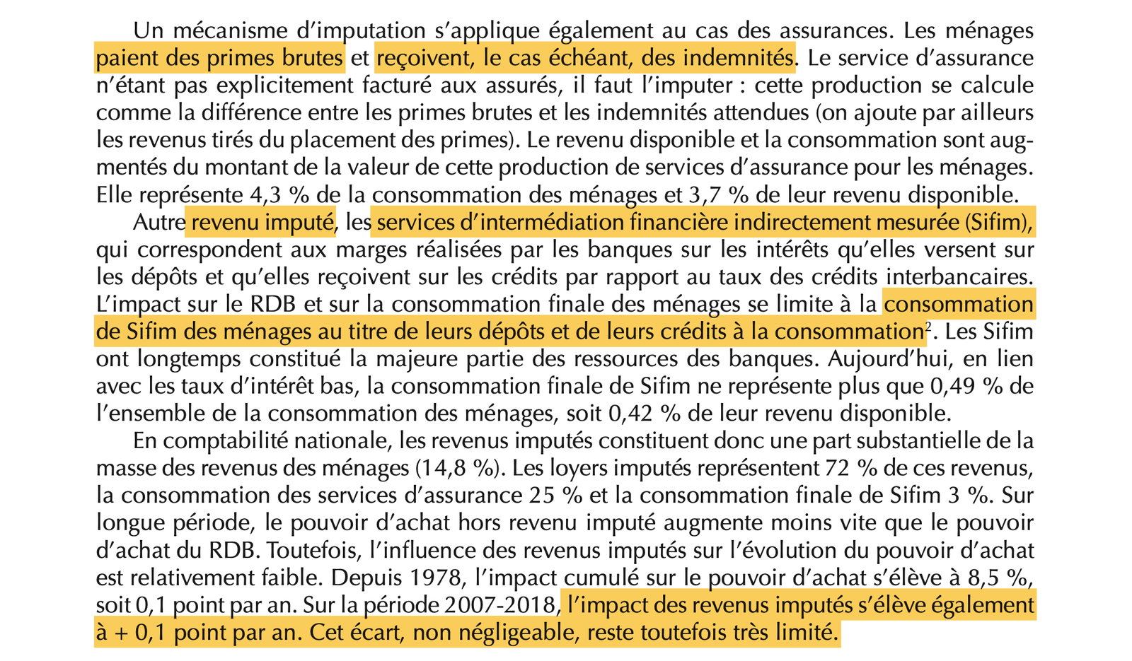 - Des revenus imputés non ressentis (assurances, loyers fictifs, Sifim) ≈ 3,7 % du RDB (Billot et Bourgeois 2019). Assurance: dommages = revenus, profits assureurs = revenu. Sifim = les ménages sont censés consommer des services bancaires égaux à la différence entre les taux interbancaires et les taux obtenus sur leurs dépôts. Environ 0.1% / an de hausse supplémentaire du pouvoir d’achat