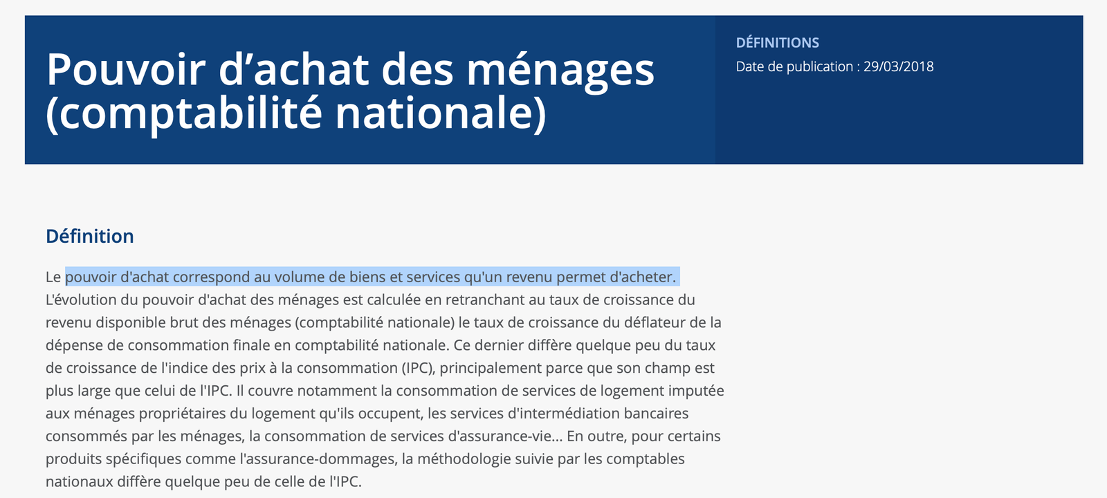 « Le pouvoir d’achat correspond au volume de biens et services qu’un revenu permet d’acheter. »